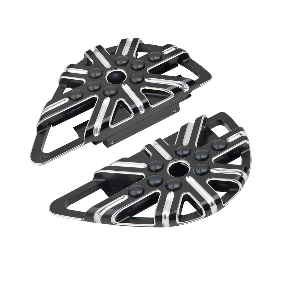 Ricavate da due pezzi di alluminio billet per creare un nuovo design innovativo. Un ottimo modo di aggiungere stile e comfort alla vostra moto. Le pedane guidatore sono lunghe 18″ (46cm), larghe 5 3/4″ (15cm) e spesse 1″ (2.5cm) e si montano usando la bulloneria di serie. Le pedane passeggero sono lunghe 7″ (18cm), larghe 4″ (10cm) e spesse 1″ (2.5cm).