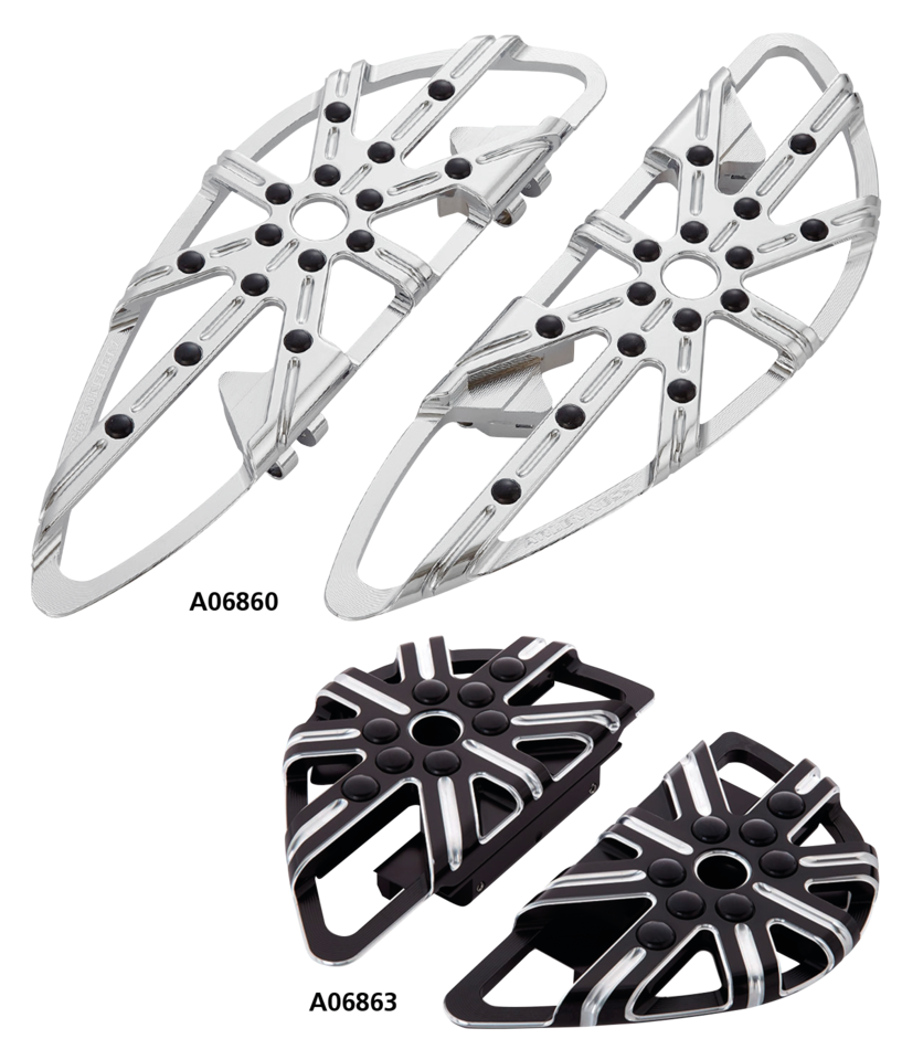 Ricavate da due pezzi di alluminio billet per creare un nuovo design innovativo. Un ottimo modo di aggiungere stile e comfort alla vostra moto. Le pedane guidatore sono lunghe 18″ (46cm), larghe 5 3/4″ (15cm) e spesse 1″ (2.5cm) e si montano usando la bulloneria di serie. Le pedane passeggero sono lunghe 7″ (18cm), larghe 4″ (10cm) e spesse 1″ (2.5cm).