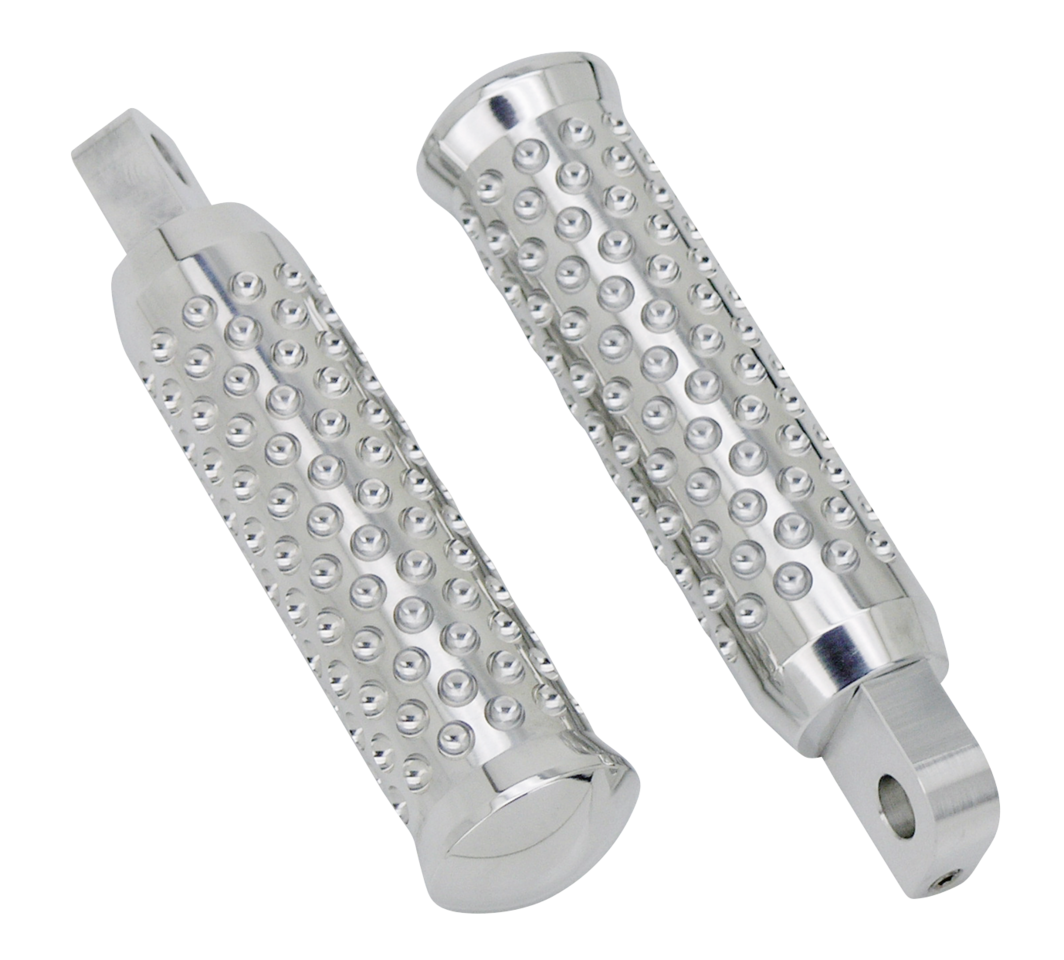 I set di pedane e pedalini Ken’s Factory sono costruiti con macchine CNC in alluminio billet da Ken’s Factory in quattro differenti disegni e con la finitura lucidata o nera con tagli a contrasto. I pedalini cambio hanno un perno filettato da 5/16″UNF e possono anche essere usati da pedalino freno dove possibile. Le pedane sono disponibili per il pilota e per il passeggero e sono vendure in coppia. Quelle del pilota sono lunghe 4 1/2″ (11.5 cm) con un diametro di 1 3/16″ (3 cm) mentre quelle del passeggero sono lunghe 4″ (10 cm) con un diametro di 1 1/16″ (2,7 cm). Le pedane hanno un attacco maschio da 7/16″ (11mm).