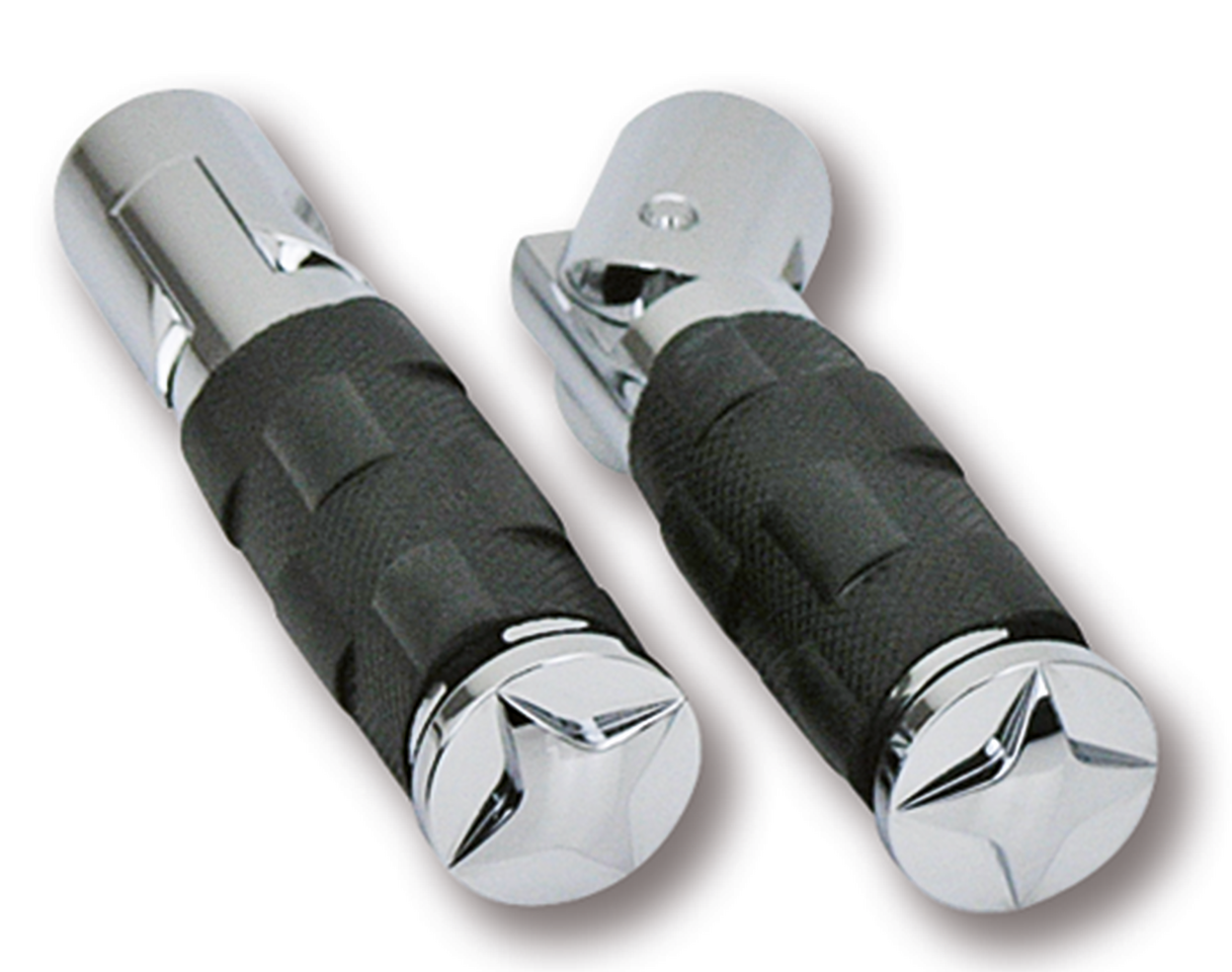 Le pedane guidatore e passeggero sono in alluminio billet laVorate a CNC con finitura cromata. Hanno degli inserti in gomma antiscivolo a forma di stella, croce o scacchi. Vendute in coppia. Hanno una lunghezza totale di 6″ (15.3 cm) e 1 3/8″ (3.5 cm) di diametro. Le pedane guidatore hanno il filetto da 3/8″‑16UNC mentre quelle passeggero lo hanno da 1/2″‑13UNC. Potrete trovare dei set di manopole abbinabili in questo catalogo nel capitolo 14.