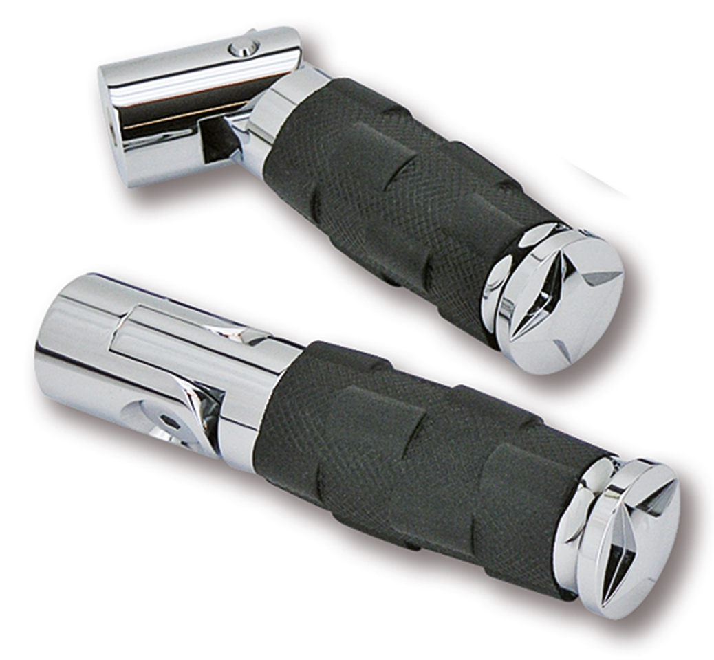 Le pedane guidatore e passeggero sono in alluminio billet laVorate a CNC con finitura cromata. Hanno degli inserti in gomma antiscivolo a forma di stella, croce o scacchi. Vendute in coppia. Hanno una lunghezza totale di 6″ (15.3 cm) e 1 3/8″ (3.5 cm) di diametro. Le pedane guidatore hanno il filetto da 3/8″‑16UNC mentre quelle passeggero lo hanno da 1/2″‑13UNC. Potrete trovare dei set di manopole abbinabili in questo catalogo nel capitolo 14.
