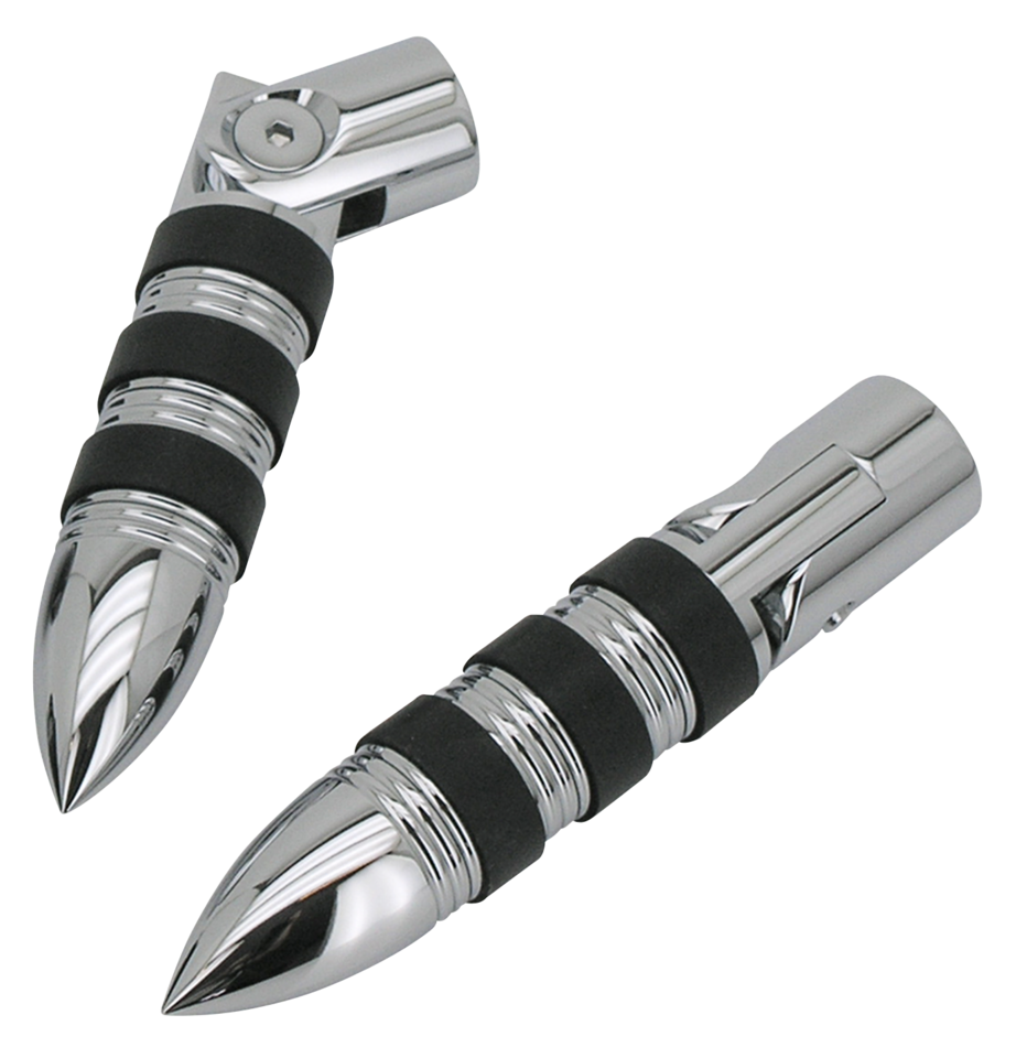 Le pedane Magnum sono in alluminio billet con finitura cromata o nera anodizzata. Hanno delle bande in gomma per aumentare la comodità e l’aderenza dei vostri stivali. Le pedane fornite con attacchi hanno una lunghezza totale di 6 7/8″ (17.5 cm) e un diametro di 1 3/16″ (3 cm). I pedalini freno o cambio solo lunghi 4″ (10 cm) con un diametro di 1″ (2.5 cm) hanno un filetto da 5/16-18 UNC che ne permette il montagggio su molti modelli di comandi stock o aftermarket. Potrete trovare le manopole abbinabili Magnum nel capitolo 14. Tutti i set di pedane Magnum sono venduti in coppia.