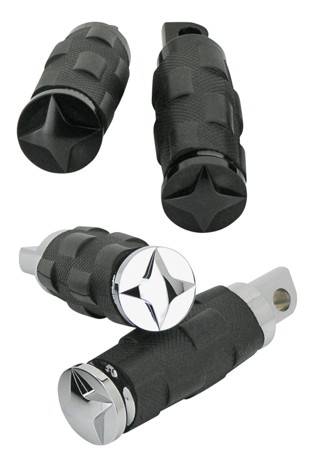 Le pedane pilota e passeggero Tornado II sono in alluminio billet e qundi cromate o anodizzate nere. Il tappo terminale ha un disegno Four Cross o liscio. Hanno un rivestimento in gomma antiscivolo per i vostri stivali e per una comodità extra. Le pedane hanno una lunghezza totale di 6″ (15.3 cm) e un diametro di 1 3/8″ (3.5 cm). Le pedane hanno un attacco maschio adatto per molte applicazioni. Manopole in abbinamento sono disponibili nel capitolo 14.