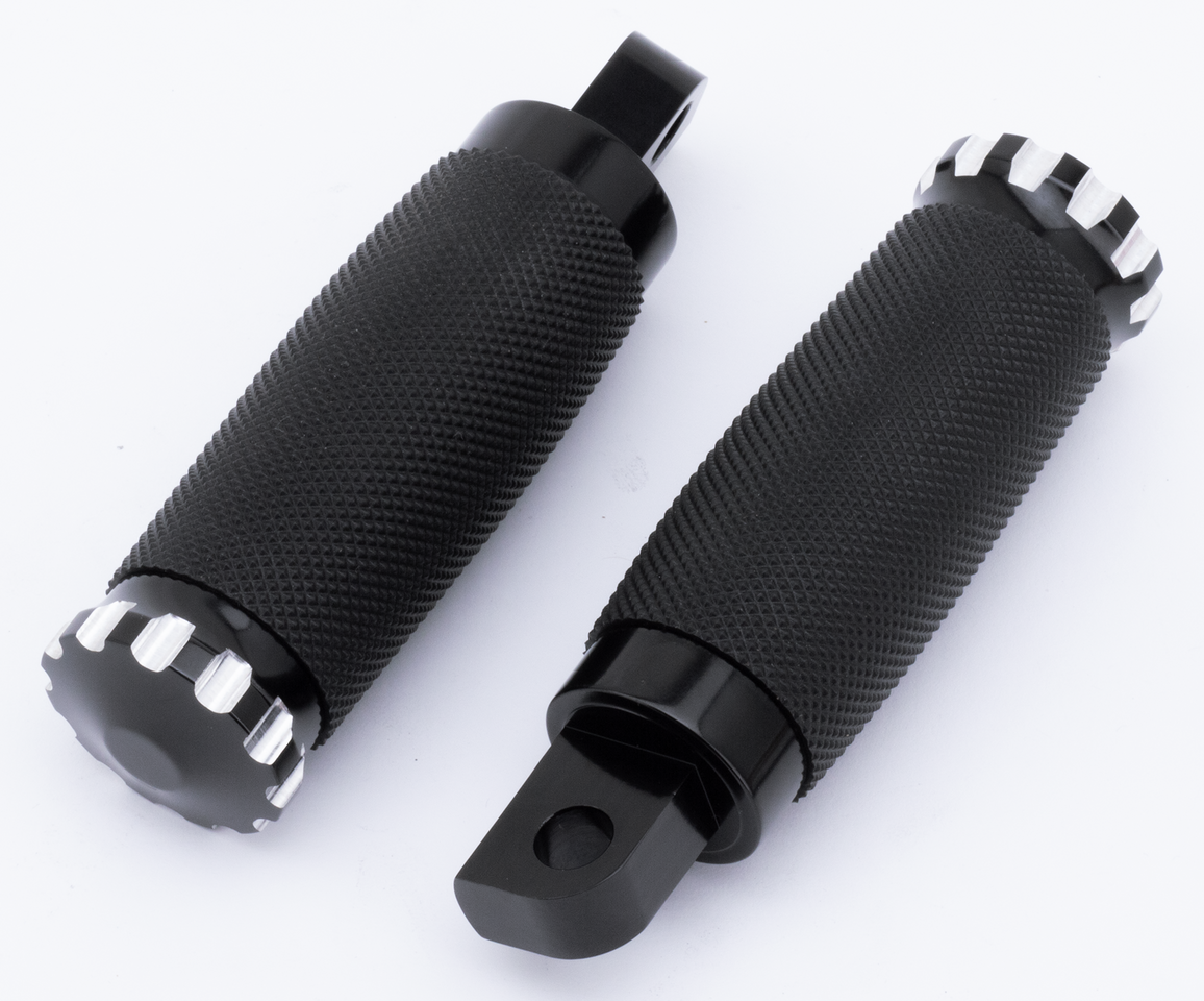 Le pedane pilota e passeggero Turbo sono in alluminio billet e qundi cromate, anodizzate nere o anodizzate bronzo. Hanno un rivestimento in gomma antiscivolo per i vostri stivali e per una comodità extra. Le pedane hanno una lunghezza totale di 6″ (15.3 cm) e un diametro di 1 3/8″ (3.5 cm). Le pedane hanno un attacco maschio adatto per molte applicazioni. Manopole in abbinamento sono disponibili nel capitolo 14.