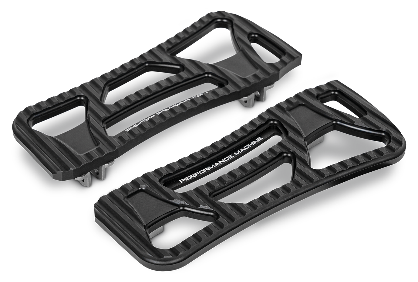 Le pedane Drifter di Performance Machine conferiscono un look da bagger performante senza sacrificare il comfort. Il profilo complessivo è corto e sottile, ma sifissano nella posizione di serie per migliorare l’altezza da terra e mantenere la comodità di utilizzare le staffe OEM. Le pedane sono lavorate in alluminio billet e rivestite con l’esclusivo Black OPS bicolore di PM che si abbina perfettamente alla finitura nera di serie del motore delle Harley.