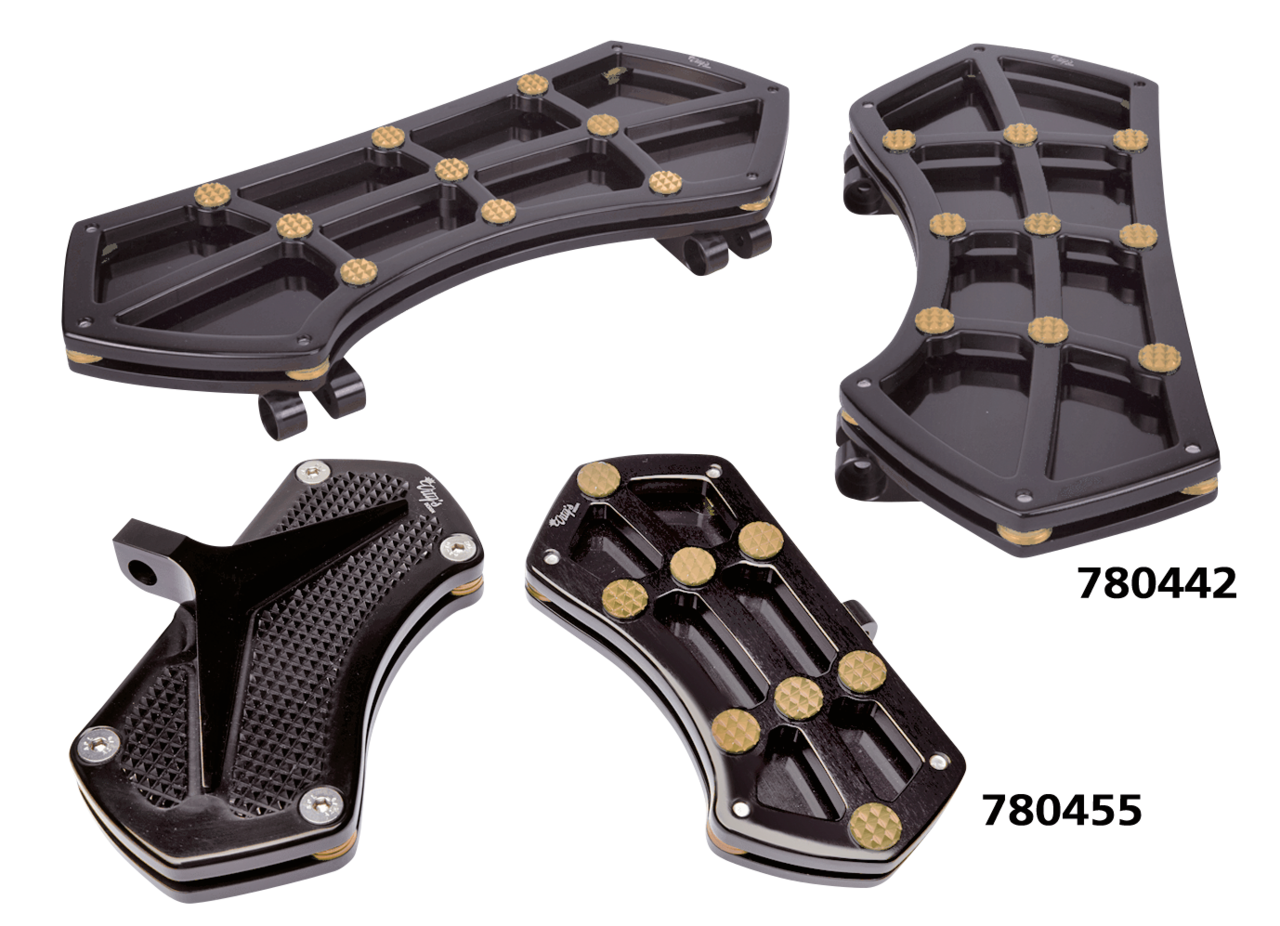 Pedane guidatore per FLD Switchback 2012-2016, Softail FL 1986-2017, Touring dal 1980 a oggi (escluso FLHTCUL & FLHTKL) e Trike dal 2009 a oggi, Nere con gemme Diamond in ottone