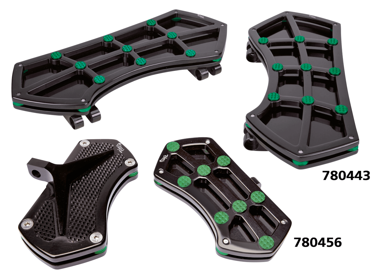 Pedane guidatore per FLD Switchback 2012-2016, Softail FL 1986-2017, Touring dal 1980 a oggi (escluso FLHTCUL & FLHTKL) e Trike dal 2009 a oggi, Nere con gemme Diamond verdi