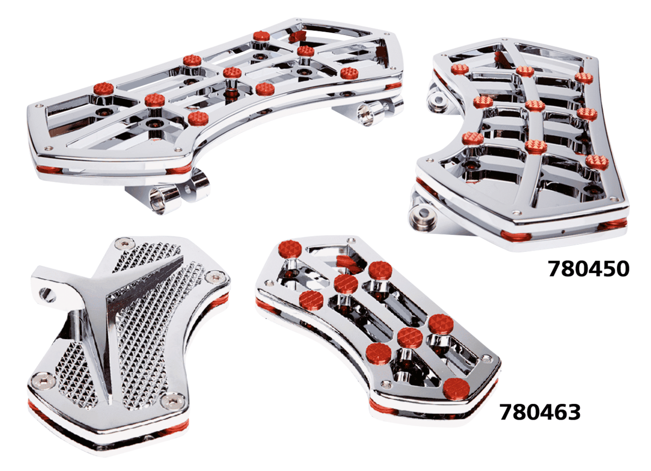 Pedane guidatore per FLD Switchback 2012-2016, Softail FL 1986-2017, Touring dal 1980 a oggi (escluso FLHTCUL & FLHTKL) e Trike dal 2009 a oggi, Cromate con gemme Diamond rosse