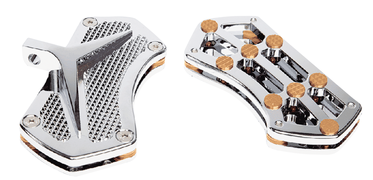 Alluminio billet. Pedane guidatore sono lunghe 13,8″ e larghe 5″. Includono 18 inserti stile Diamond per la massima aderenza. Le pedane guidatore si montano sugli attacchi di serie. Pedane passeggero si adattano alle staffe di serie Street Glide e in altri modelli con supporti femmina pieghevoli verticali. Per tutti Touring ad eccezione Street Glide, è necessario ordinare separatamente i supporti delle pedane passeggero Vity. Venduti in coppia. Vity’s Design è italiana per quel motivo offre i colori rosso e verde dalla bandiera e il blu dalle divise sportive della Nazionale come colore del pedalino del freno.