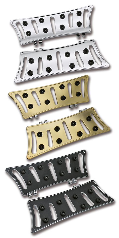Queste pedane in alluminio aggiungono un tocco custom alla vostra moto. Sono semplici da installare con le loro staffe di montaggio pronte da attaccare agli attacchi pedane di serie. Il tappetino in gomma Zi-Cone fornisce attrito extra e comfort in ogni condizione. Pedane passeggero, pedali freno e pedalini cambio abbinabili disponibili separatamente. Vendute in coppia. I gommini di ricambio sono venduti in set da 16.