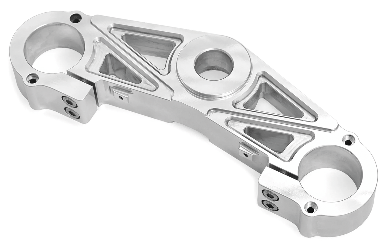 Per favore, prestate attenzione ai dettagli del design di questi piastre superiori e inferiori della forcella, realizzati e rifiniti con precisione. La piastra inferiore deve essere installata con il perno di sterzo OEM; per rimuoverlo e installarlo è necessaria una pressa idraulica. Gli alberi superiori e inferioriLe piastre inferiore e superiore sono vendute singolarmente, per cui è possibile scegliere tra tutto nero, tutto lucido o qualsiasi combinazione.
