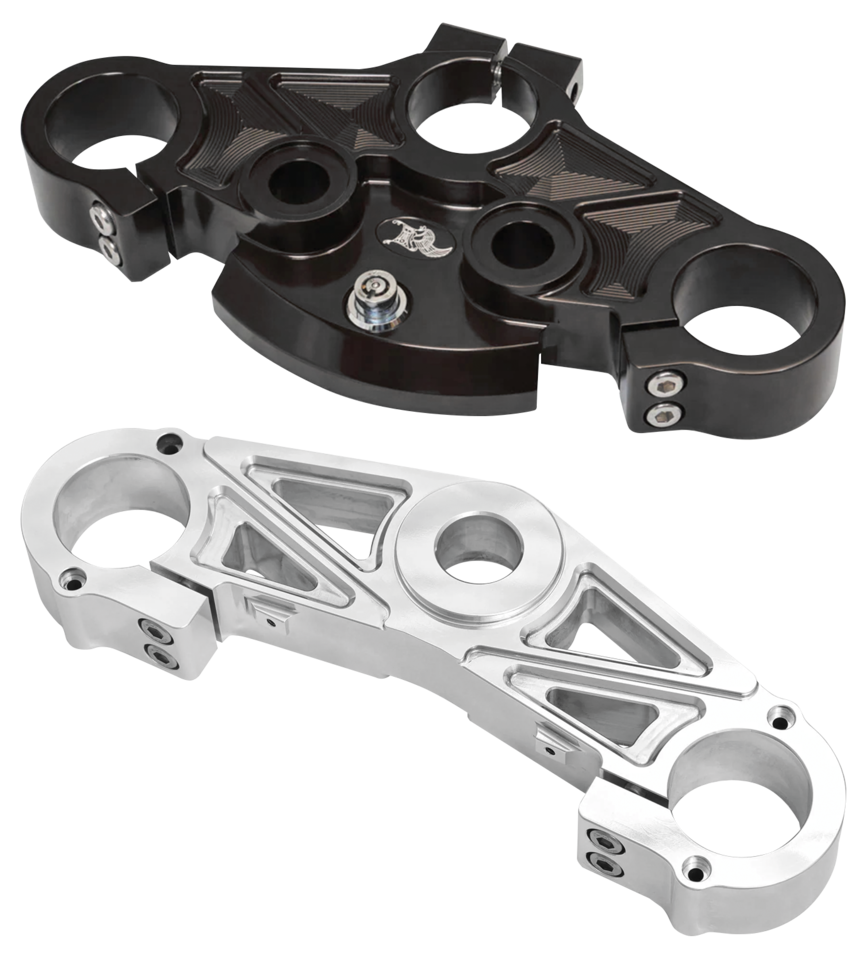 Per favore, prestate attenzione ai dettagli del design di questi piastre superiori e inferiori della forcella, realizzati e rifiniti con precisione. La piastra inferiore deve essere installata con il perno di sterzo OEM; per rimuoverlo e installarlo è necessaria una pressa idraulica. Gli alberi superiori e inferioriLe piastre inferiore e superiore sono vendute singolarmente, per cui è possibile scegliere tra tutto nero, tutto lucido o qualsiasi combinazione.