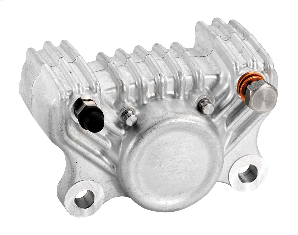 Ricavata dall’alluminio forgiato per maggiore rigidità e lavorata a CNC con tolleranze precise e maggiore potere frenante, la pinza Super Freni a 2 pistoni darà ai vostri freni un look nostalgico. Si abbina perfettamente ai comandi K-Tech Deluxe che troverete in questo catalogo. Le pinze sono disponibili in alluminio lucidato o in alluminio grezzo e sono fornite complete di pastiglie e bulloni banjo. La distanza da foro a foro è 3.25″ (8,25cm), la larghezza della pinza è di 3″ (7,6cm) e dal centro della pinza all’interno è di 1.5″ (3,8cm). Staffe di montaggio in acciaio inox sono disponibili separatamente per l’uso con dischi freno da 11 1/2″ per applicazioni selezionate o vanno costruite appositamente.