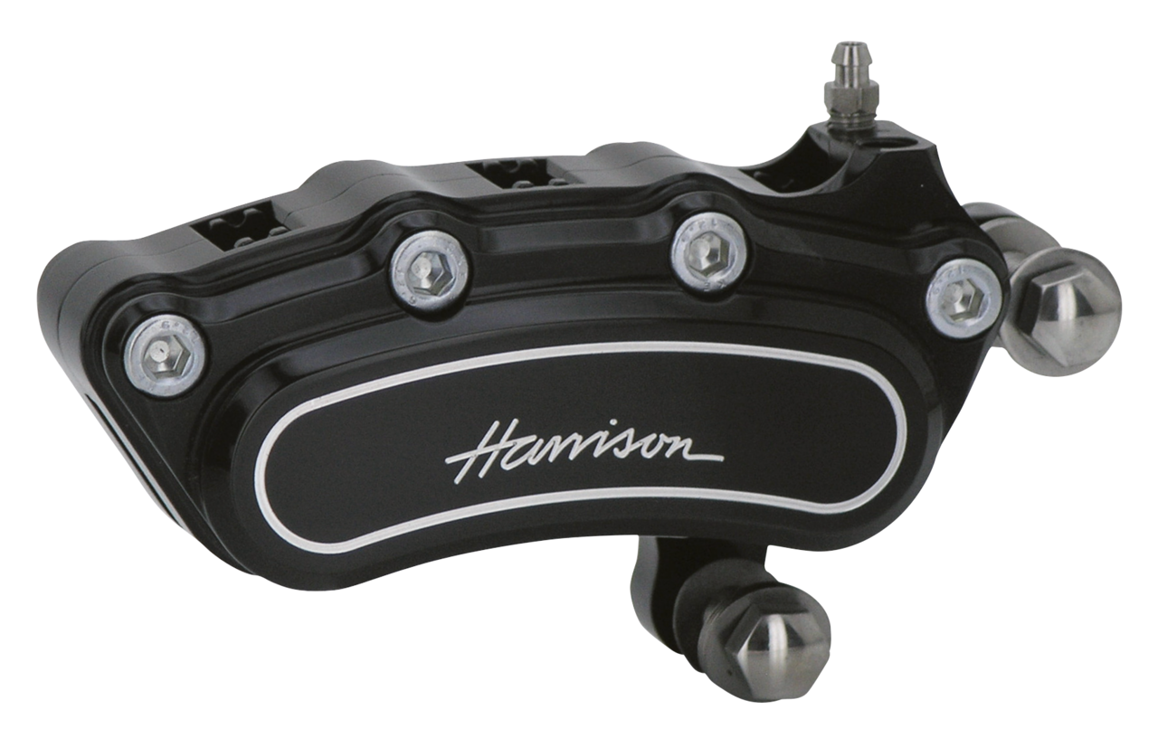 Per chi sta cercando un look “smilzo” abbiamo anche le pinze a 4 o 6 pistoni nel nuovo disegno Harrison “Slimline”. Come le originali Harrison Billet ogni pinza è lavorata con precisione con macchine a CNC da una lega di alluminio molto leggera di qualità aeronautica e con dei pistoni sempre in lega d’alluminio a bassa espansione con un trattamento di anodizzazione e indurimento. Ogni pinza usa una pastiglia per pistoncino. Questo è un vantaggio secondo Harrison in quanto la frenata è più potente specialmente in condizioni di umidità, dove i primo set di pastiglie toglie l’acqua mentre i 2 o 4 set successivi continuano a frenare. In questo modo si rimuove l’effetto “skating” sul disco, e quindi la frenata si fa improvvisamente più decisa in quanto il disco è asciutto. Le pinze Slimline sono veramente progressive, con una relazione sensibie e diretta tra la pressione sulla leva e l’aumento della potenza in frenata. Queste pinze sono disponili nella versione lucidata, nera o cromata a 4 o 6 pistoncini. Le anteriori montano direttamente sui gambali della forcella, mentre le posteriori sono fornite con staffa di montaggio. Le viti di montaggio e i rasamenti in acciaio inox peri il centraggio della pinza sul disco sono inclusi con ogni kit. Dischi freno con lo stesso design sono disponibili e li trovate in questo catalogo.