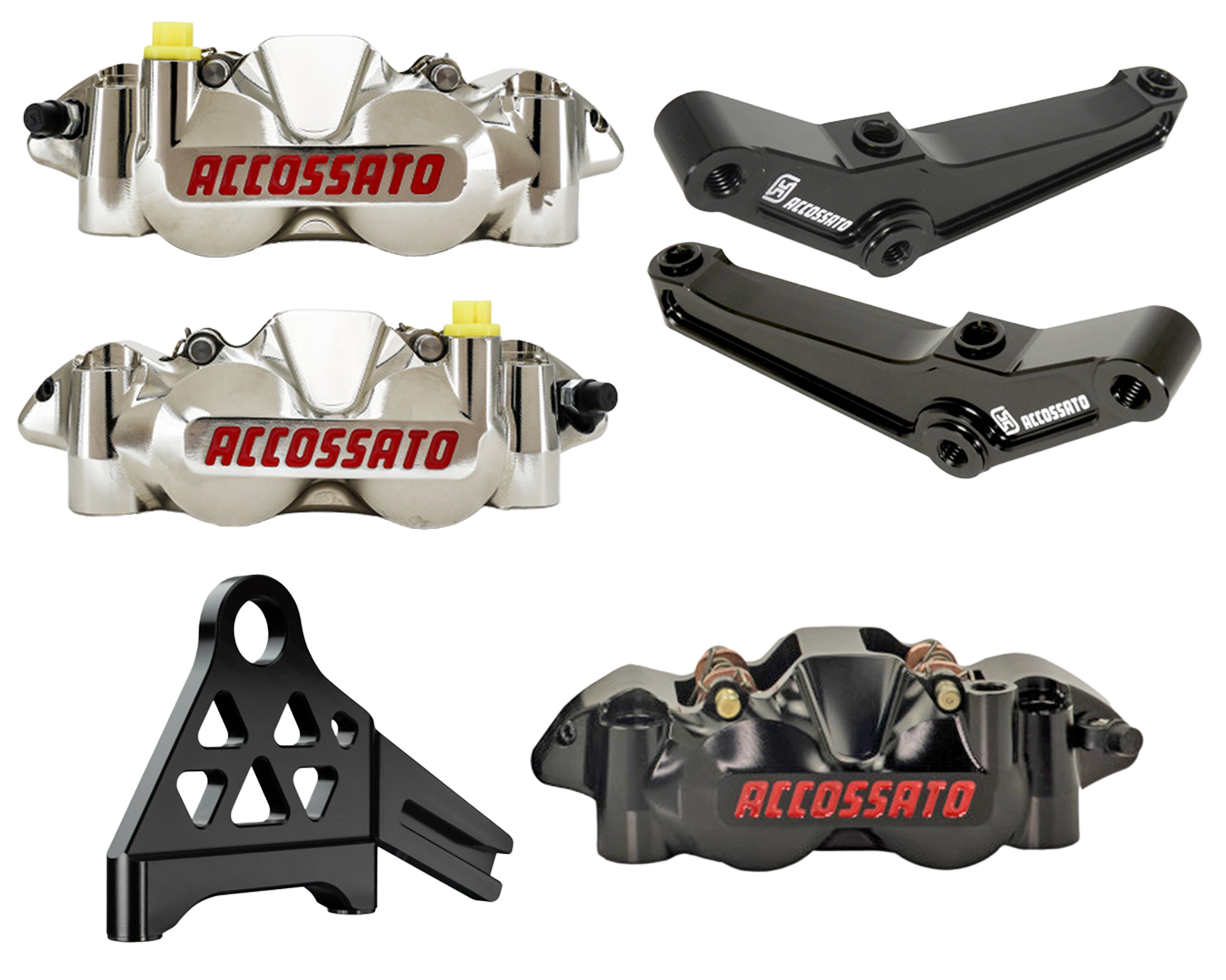 Le pinze freno radiali Accossato sono progettate con la tecnologia più avanzata, utilizzando i migliori materiali disponibili sul mercato. Un chiaro esempio è dato dalla struttura delle pinze, lavorate con macchine CNC a 5 assi. La forma delle pinze è stata realizzata con il supporto della ricerca CAD al fine di ottenere il peso più leggero, la migliore rigidità del corpo e la migliore capacità di dissipazione del calore attraverso uno speciale trattamento di ossidazione dura. Durante la lavorazione, il corpo della pinza è controllato 3-D al 100% dalle; nella fase successiva, il prodotto viene ossidato attraverso uno speciale trattamento che conferisce una resistenza duratura. Questa pinza è il loro modello di punta ed è consigliata per l’uso in gara. Queste pinze radiali monoblocco lavorate a CNC sono dotate di pistoni in titanio e hanno una distanza tra i bulloni di montaggio di 108mm. Le pinze sono fornite senza pastiglie dei freni, ordinate separatamente le pastiglie di vostra scelta. Accossato consiglia di utilizzare liquido freni DOT 4 nelle loro pinze.