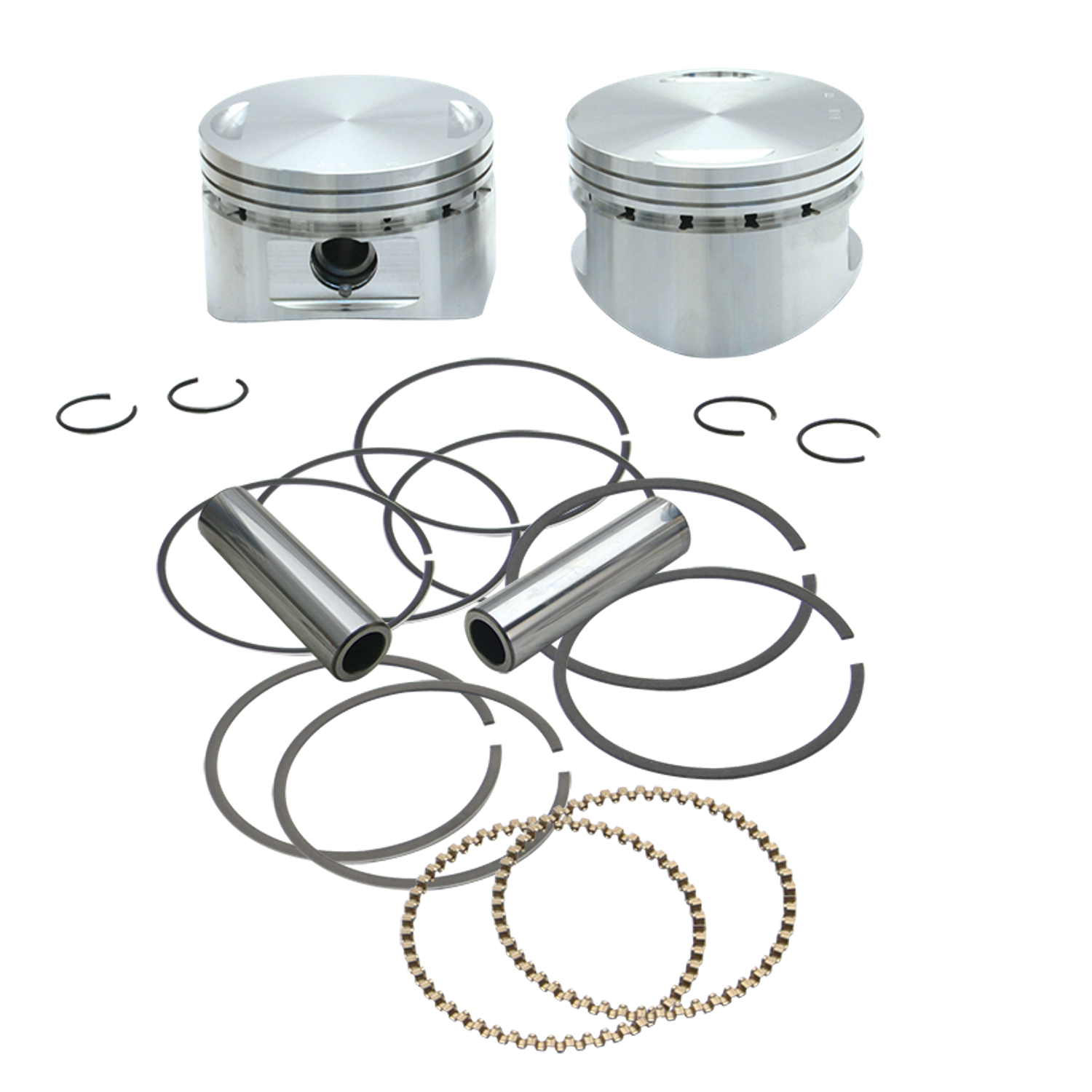 Kit pistoni S&S di ricambio per l’uso in motori S&S 96CI V2, 113CI Super SideWinder e 124CI Super SideWinder Plus, così come su molti kit Big Bore e Stroker S&S e aftermarket. Il kit contiene 2 pistoni, fasce, spinotto e clips. I set di fasce sono disponibili anche separatamente.