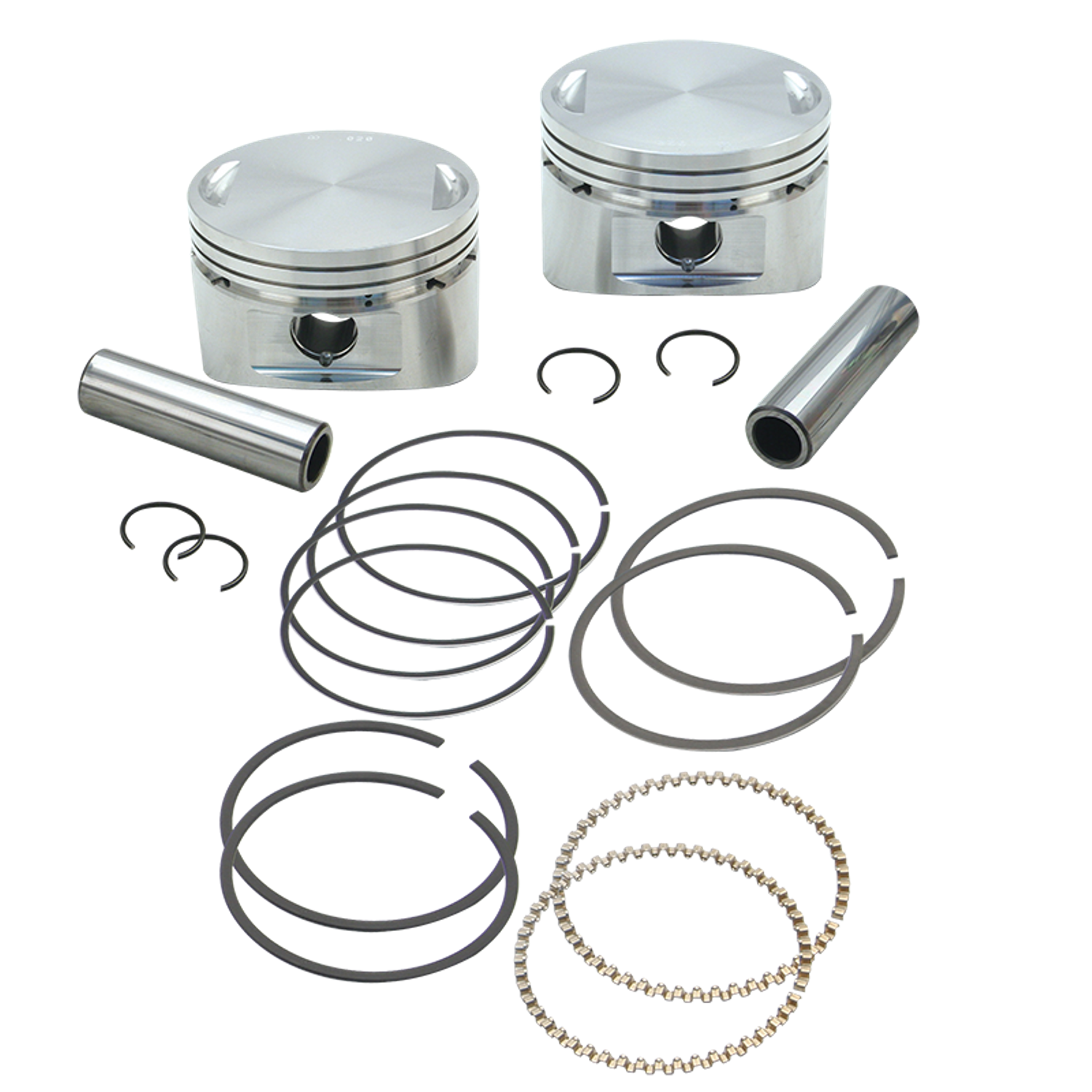 Kit pistoni S&S di ricambio per l’uso in motori S&S 96CI V2, 113CI Super SideWinder e 124CI Super SideWinder Plus, così come su molti kit Big Bore e Stroker S&S e aftermarket. Il kit contiene 2 pistoni, fasce, spinotto e clips. I set di fasce sono disponibili anche separatamente.
