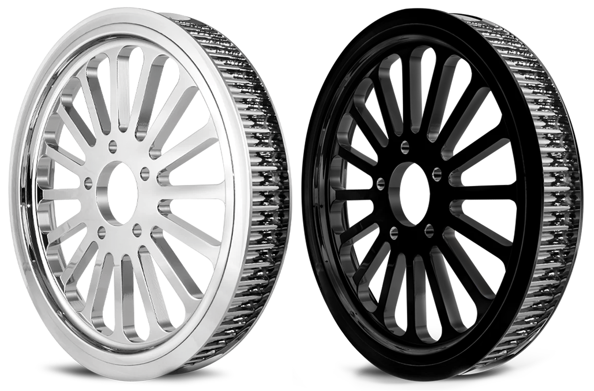 Queste pulegge Mammoth Super Spoke completano le nostre ruote Mammoth Fat Spoke. Sono ricavate da un blocco di alluminio massiccio e poi cromate o verniciate a polvere nera. I 16 raggi creano una composizione perfetta con le ruote Mammoth a 52 raggi, ma possono essere utilizzati con qualsiasi tipo di ruota. Queste pulegge sono compatibili con tutti i modelli con le dimensioni indicate, ma dovranno essere distanziate in linea con la puleggia anteriore.