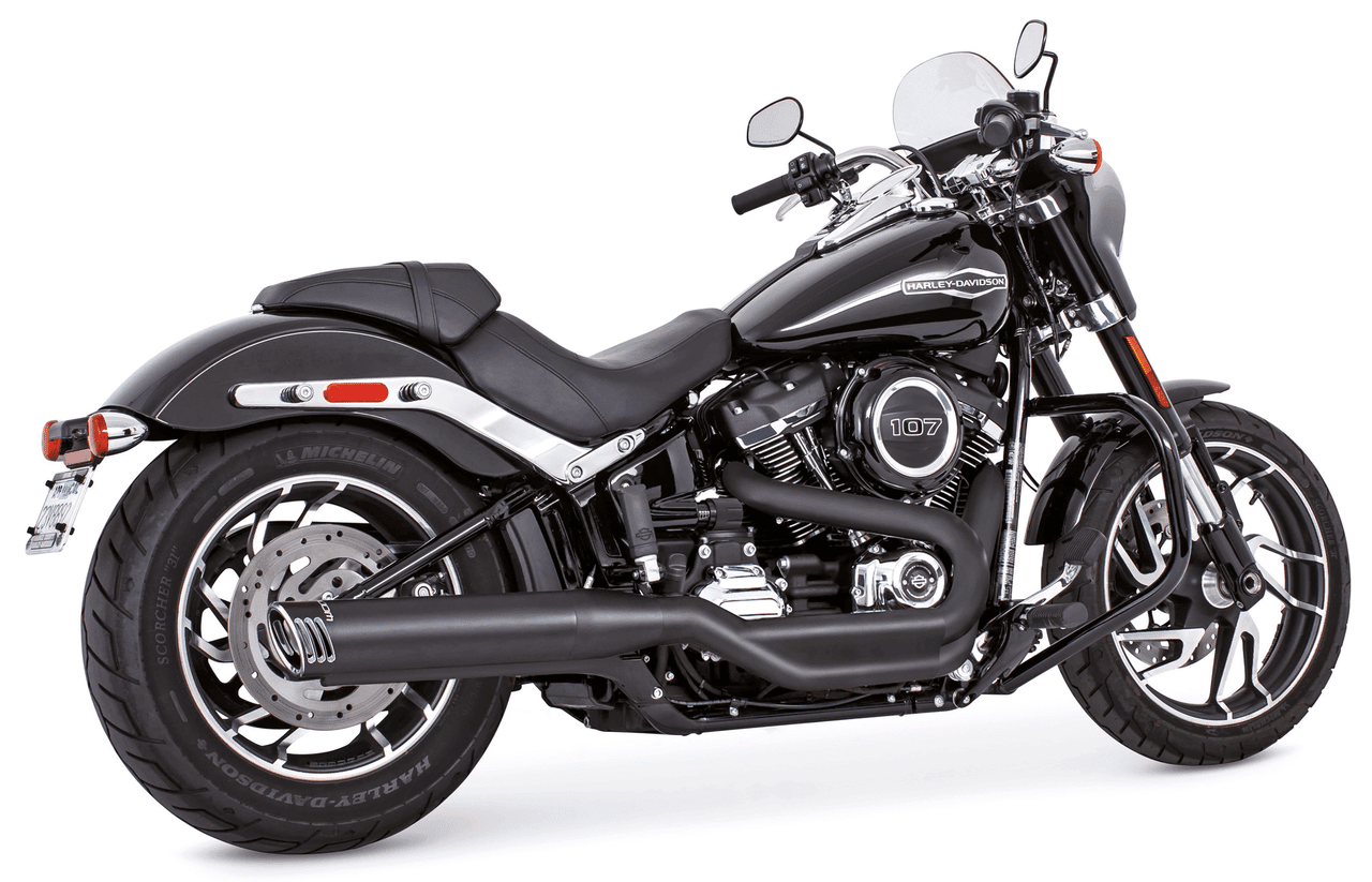 Softail FLSB Sport Glide dal 2018 a oggiSilenziatore singolo, diametro 4″Versione race, Nero con tappi finali scolpiti neri