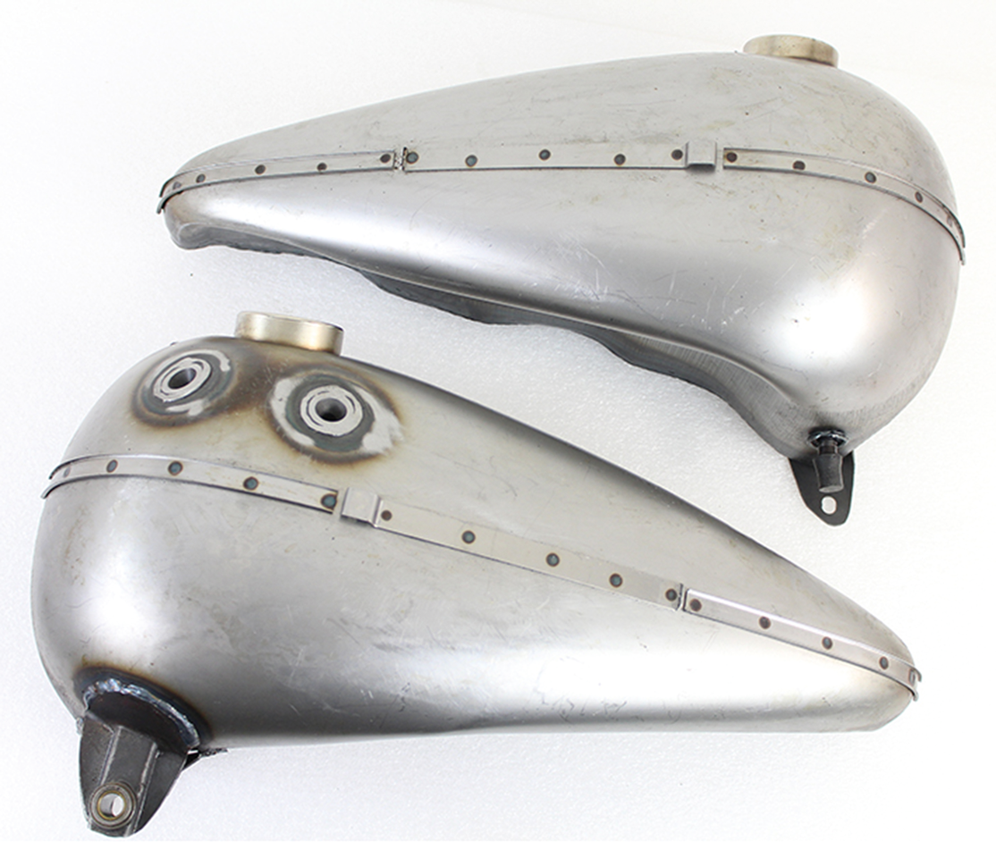 Riproduzione V-Twin Mfg. del set di serbatoi da 3,5 galloni (13,2 litri), non disponibile da tempo, utilizzato sui Big Twin OHV del 1941-1946. Monta la valvola di intercettazione ad asta originale, gli emblemi e i supporti, due tappi della benzina a camme ventilati, il tubo della benzina incrociato e la guida del cambio. Non è previsto il montaggio di emblemi. Richiede un montaggio manuale e uno spessoramento per ottenere un allineamento corretto per il cruscotto Cat-Eye, per l’inserimento del tubo del carburante e per raggiungere l’altezza corretta.