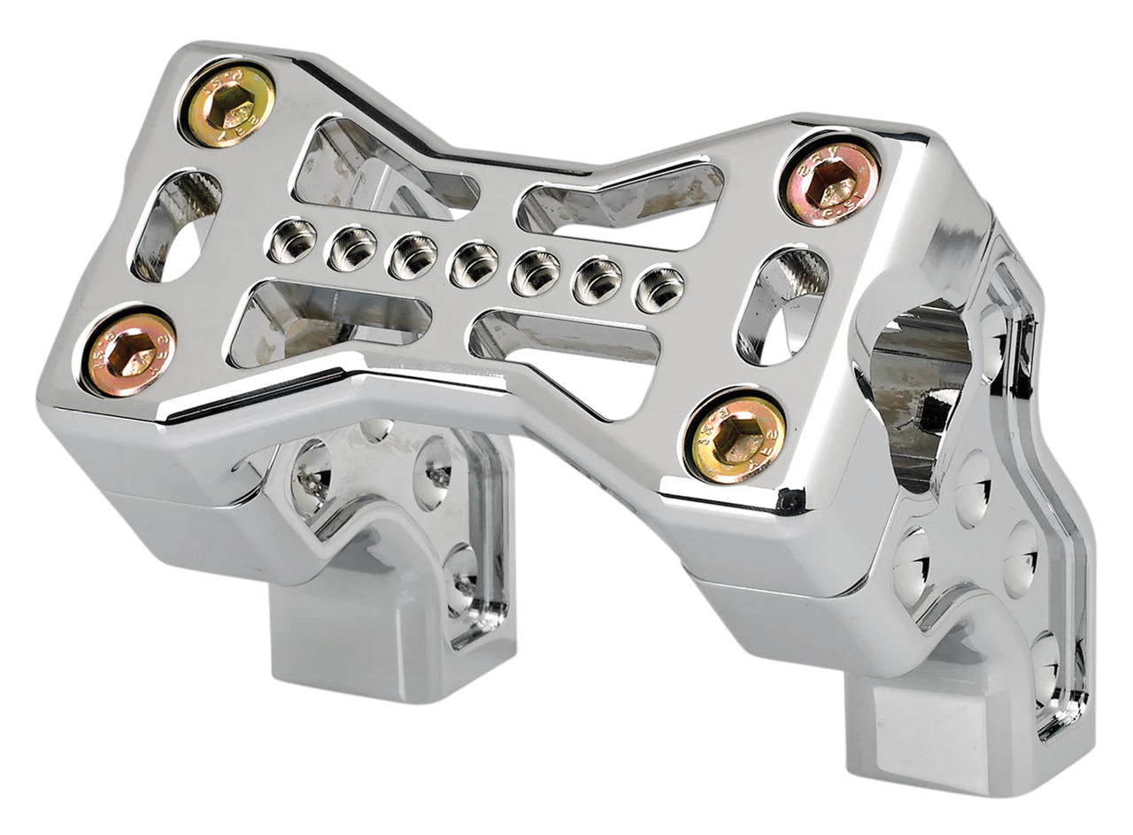 Questi riser offrono un arretramento di 1 1/2″ (3,8cm) con un altezza di 2 1/2″ (6,4cm) e sono realizzati per manubri da 1″. Essendo dotati di morsetti superiori monoblocco in stile Bridge, sono ottimi anche per i Fat Bar che si riducono a 1″ nell’area di serraggio. I riser si adattano alle piastre forcella superiori standard Harley-Davidson con fori di rialzo da centro a centro da 3 1/2″ (8,9cm). I riser sono filettati da 1/2-13″ UNC e sono lavorati a controllo numerico su barra 6061-T6 per la massima resistenza.