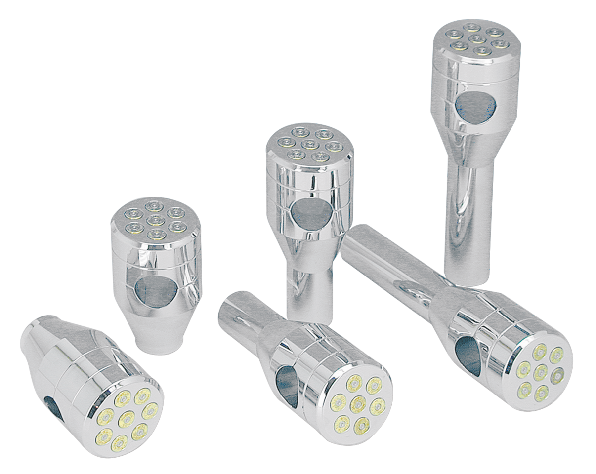 Per quelli che vogliono qualcosa di veramente speciale. Questi riser della serie Magnum Police sono decorati con veri bossoli di proiettili Magnum. I riser sono ricavati da blocchi d’alluminio billet e sono disponibili nelle altezze di 2 1/2″ e 6″. Potete avere i riser cromati o neri, ma i bossoli rimangono gli stessi. Disponibili in questo catalogo anche manopole, coperchi accensione, coperture tappi benzina e tappi finali con lo stesso design.