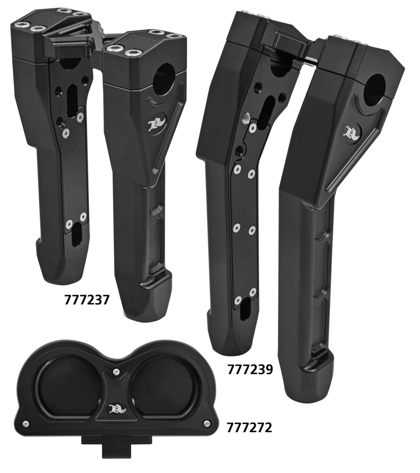 Questi riser in alluminio billet con finitura anodizzata nera portano le linee rette dalla parte inferiore della forcella al morsetto della piastra superiore, e per alcuni di voi, alla parte superiore del manubrio. Per coloro che scelgono il kit di rilocazione degli indicatori Next Level, Ken ha lasciato dei punti di montaggio a disposizione, in modo che tutto sia ben saldo al suo posto. I riser sono dotati di un morsetto superiore monoblocco con design a “X” che rafforza la sensazione di sicurezza e resistenza.