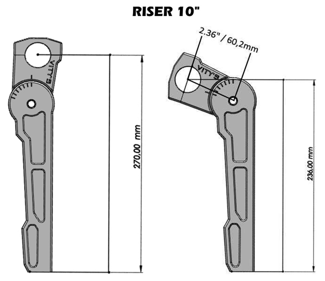 Riser in alluminio billet 8″ (20cm) o 10″ (25cm) con testa regolabile e morsetto superiore in un unico pezzo per l’uso con manubri che hanno un diametro di 1″ agli attacchi dei riser. Viene fornito completo di bulloni riser M12-1.5x70mm. Il morsetto superiore è pronto ad accogliere il quadro strumenti digitale OEM.