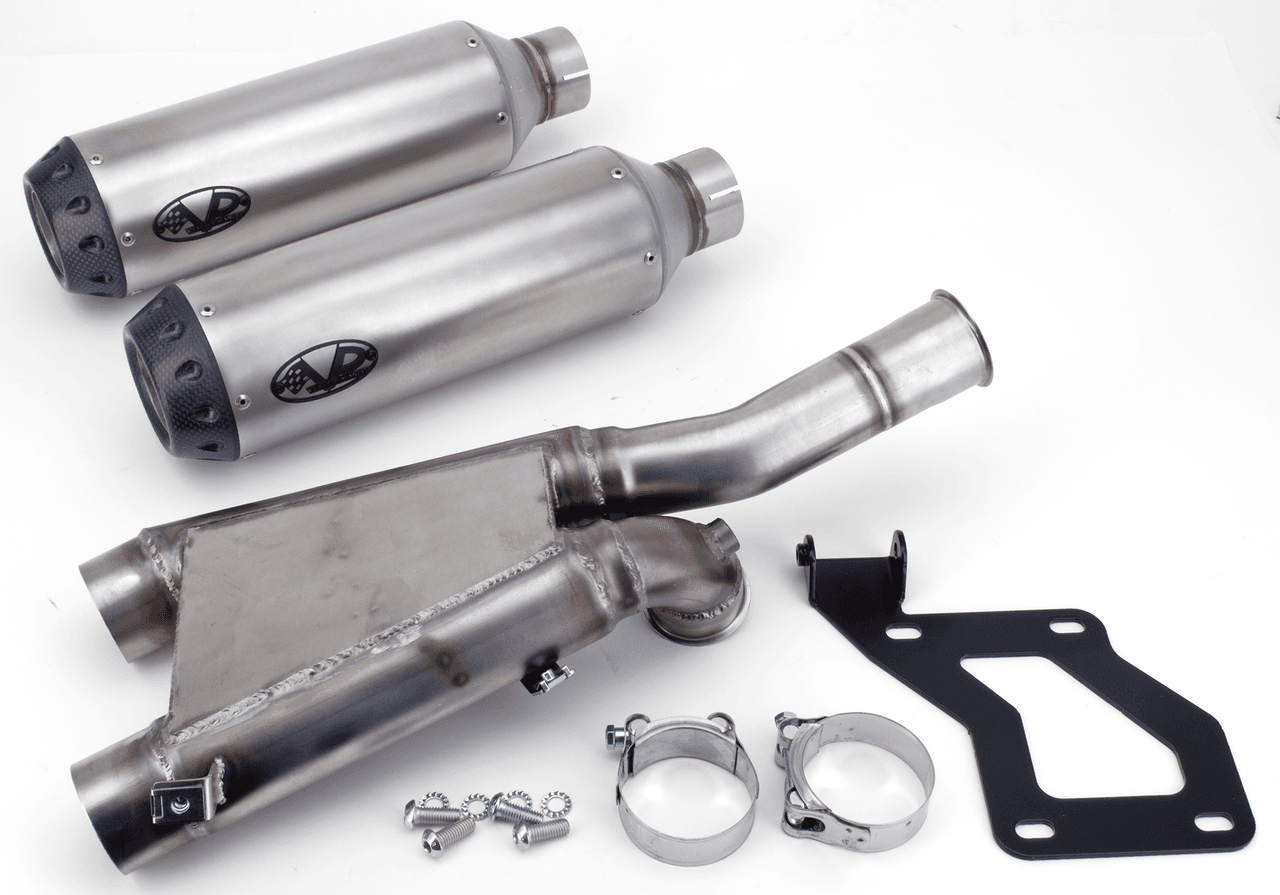 Questo set di collettori e due silenziatori con catalizzatori incorporati sostituisce il silenziatore di serie e riutilizza il collettore di scarico anteriore e posteriore di serie. I silenziatori sono dotati di dB killer rimovibili, ma si noti che la rimozione dei dB killer annulla l’omologazione E.
