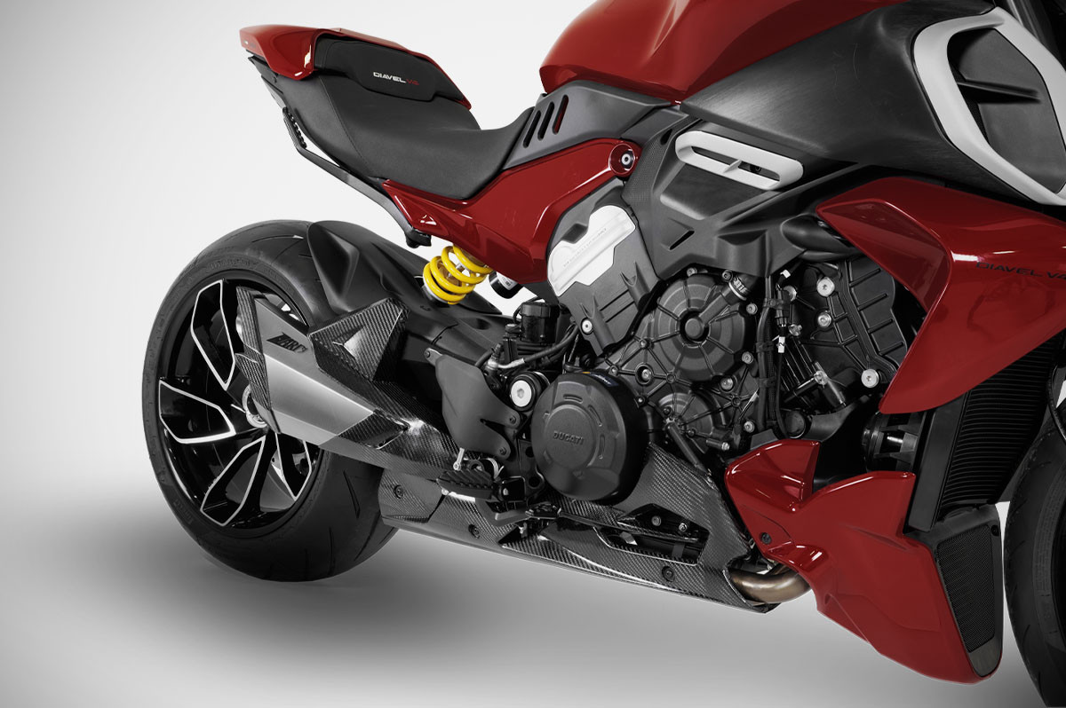 L’impianto di scarico “Mako” Zard per la Ducati® Diavel V4, si distingue per il suo design sportivo e iconico, ispirato alla forma affilata di una pinna di squalo. Realizzato a mano in Italia in acciao Inox AISI 304, con fodero in titanio di grado 1, paracalore e scocche laterali protettive in fibra di carbonio, questo scarico non solo migliora l’estetica della moto, ma ottimizza anche il flusso d’aria, aumentando le prestazioni aerodinamiche. Disponibile in versione racing o omologata Euro 5, il kit slip-on “Mako” scarico Ducati Diavel V4 è disponibile in versione racing o omologata secondo la normativa Euro 5. La versione omologata comprende il box catalizzatore in acciaio inossidabile, entrambi gli scarichi non sono corredati da dB-Killer; tuttavia, la versione omologata rispetta i limiti di emissione sonora richiesti per la circolazione stradale. Grazie alle soluzioni tecniche avanzate, lo scarico “Mako”, permette di ridurre il peso di -9,1 kg per la versione racing e -5,7 kg per la versione omologata Euro 5 (rispetto ai silenziatori standard) incrementando le prestazioni di +5,1 cv per la versione racing e +2,8 cv per la versione omologata (rispetto al silenziatore standard), esaltando il carattere sportivo della Ducati Diavel V4.