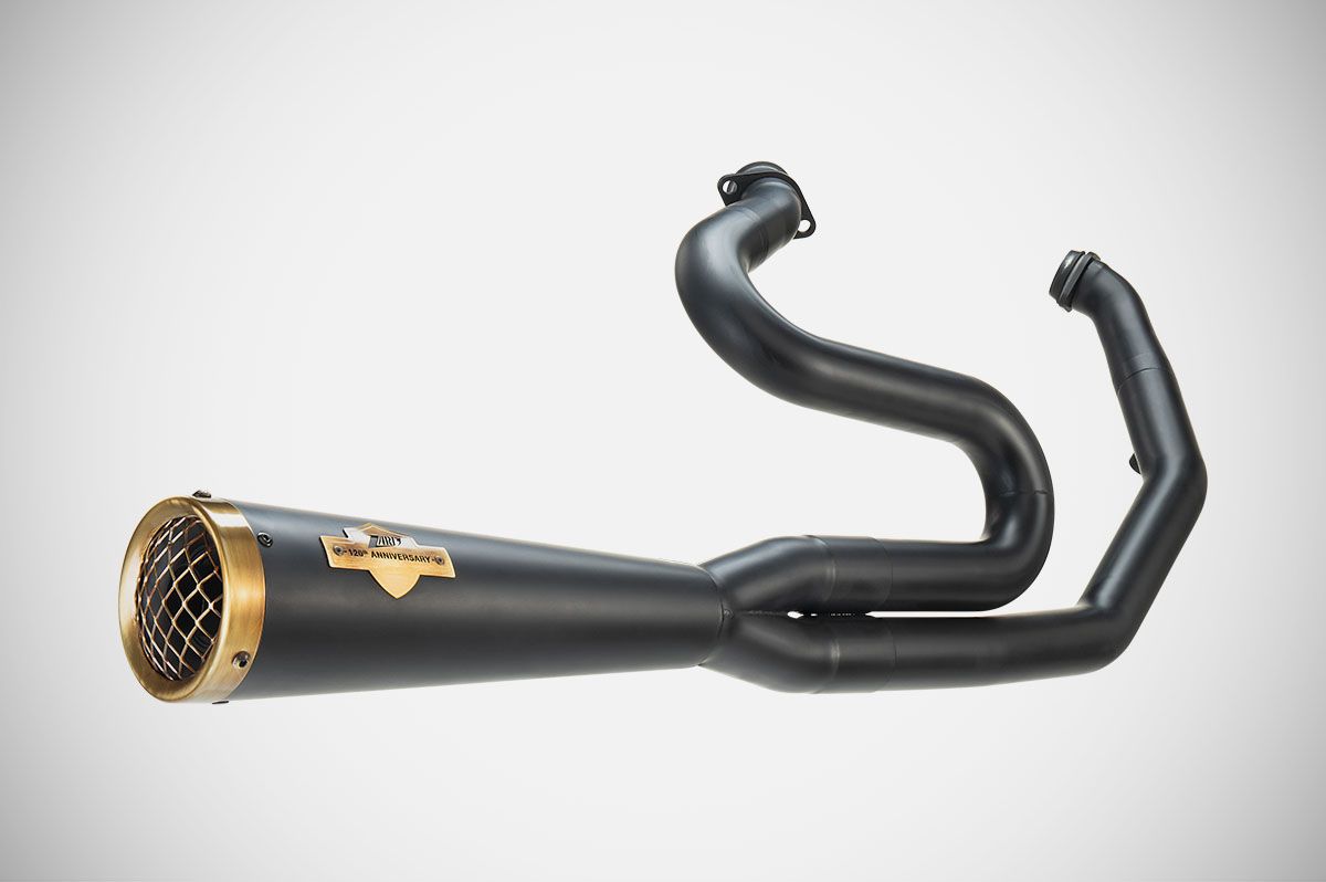 Il kit 2 in 1 120TH per la Harley-Davidson® Road Glide Limited, in edizione limitata 120TH, per celebrare la nascita del mito a due ruote, è un sistema di scarico completo, realizzato in acciaio inox AISI 304, composto da collettori, silenziatore a cono corto e fondello in acciaio inox bronzato. Progettato dal Centro Stile Zard, questo kit completo è disponibile in versione racing, omologata Euro 4/5, con finitura nero opaco Cerakote®. Il risparmio di peso è incredibile (-9,5 kg per la versione racing e -9,3 kg per la versione omologata Euro 4/5 rispetto ai silenziatori standard) con un incremento reale delle prestazioni del motore (+4 cv per la versione racing e +2,1 cv per la versione omologata rispetto al sistema di scarico standard).