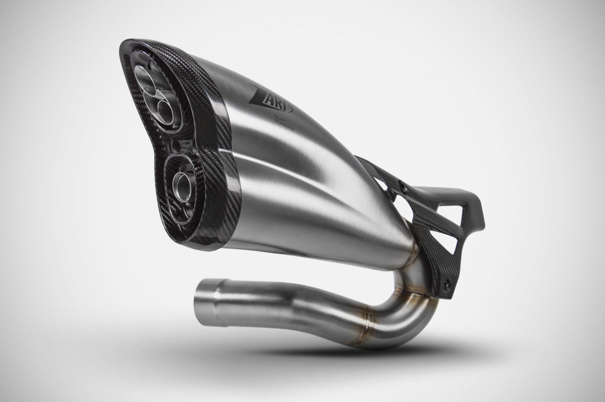 Questo scarico, disponibile in finitura satinata o nera Cerakote® è dotato di fondello in fibra di carbonio e fodero in acciaio inox. Si distingue per il notevole incremento delle prestazioni di +5.8 CV e per l’estrema leggerezza, -7.4 kg rispetto al sistema di scarico standard.