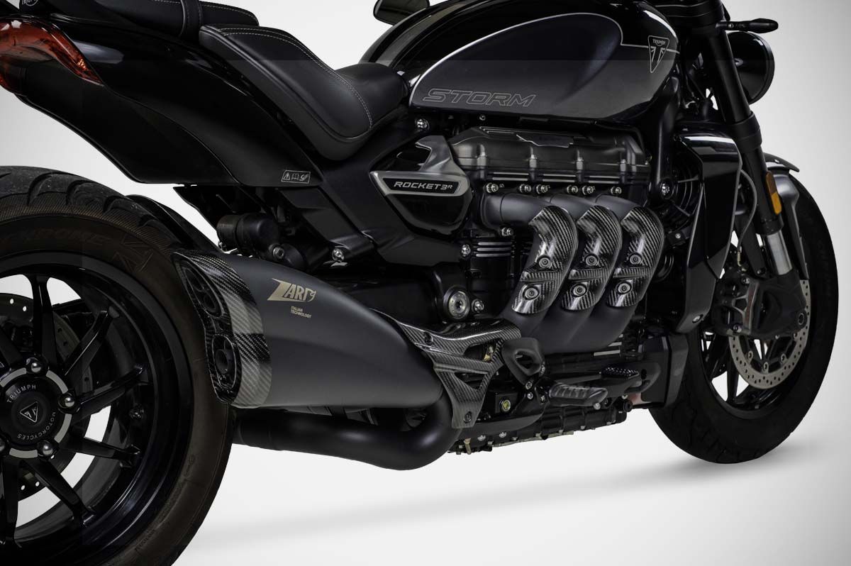 Lo Slip-on Kit Racing Zard per la Triumph® Rocket 3 Storm è interamente progettato e realizzato a mano in Italia in acciaio inox AISI 304. Il sistema di scarico, composto da slip-on, collettore e due coperture laterali in fibra di carbonio, presenta un design unico e aereodinamico, impiegando solo materiali di alta qualità.