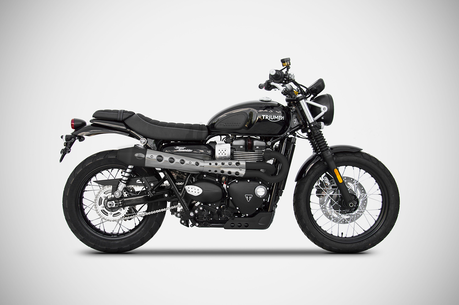 Il Full Kit “Conico” alto per la Triumph Scrambler 900, realizzato interamente a mano in Italia, è composto da collettore e silenziatore in acciaio inox AISI 304. È disponibile con finitura satinata, satinata con paracalore nero o nera Cerakote®. L’intero impianto si distingue per leggerezza, resistenza e un sound profondo e coinvolgente che esalta l’anima scrambler della moto. Il layout alto e compatto dona alla moto un look slanciato e muscoloso. Contribuisce a un notevole aumento della potenza e una riduzione di peso di -5,6 kg, per un peso complessivo di 4,2 kg, unito a un sound più corposo. Prodotto non omologato per uso stradale. NOTA: il paracalore della versione con trattamento ceramico nero ha in dotazione sia la retina nera che quella silver. Compatibile con Triumph Street Scrambler 900 (2017–2023)