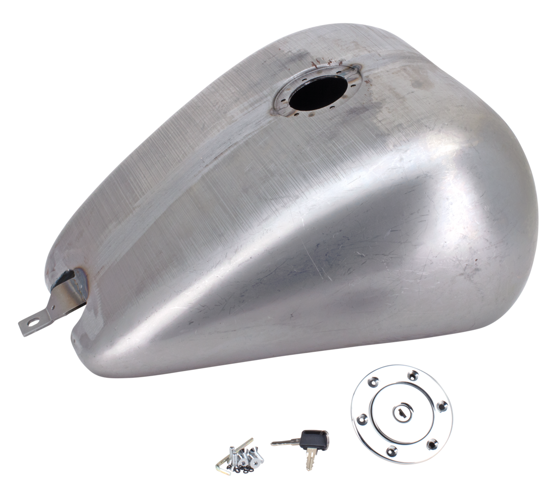 Questo serbatoio d’acciaio, con la parte superiore smussata cambierà drasticamente l’aspetto del vostro Softail Twin Cam se non avete intenzione di montare il cruscotto. Può essere usato con la sella stock. Il serbatoio è fornito completo di tappo aeronautico centrale in alluminio billet con serratura, e contiene circa 5.1 galloni (19,3L.) di benzina.