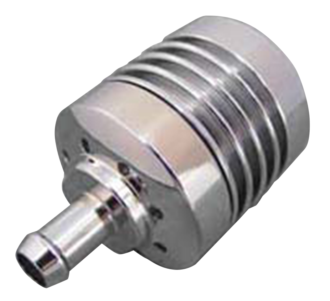 Il contenitore di sfiato cromato è dotato di un attacco a innesto NPT da 1/8″ per tubo da 3/8″ e può essere aperto per la pulizia. Il contenitore ha un diametro di 1 3/8″ (35mm) ed è lungo 1 5/8″ (41mm).