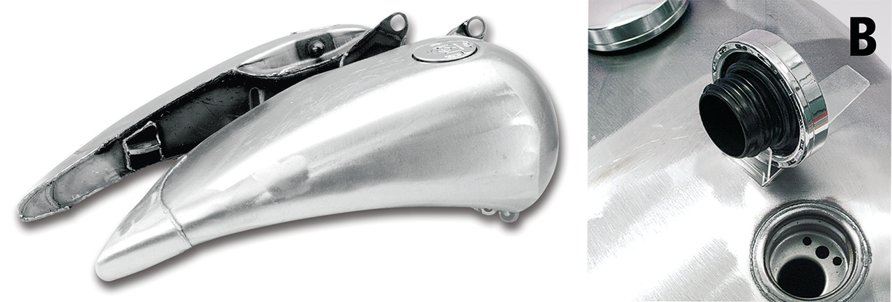 Questo serbatoio in due pezzi darà al tuo Softail un look filante e morbido. Questo serbatoio è costruito saldando due prolunghe da 2″ al nostro serbatoio allungato, rendendolo in totale più lungo di 4″ (10 cm). Questa sezione più lunga rende il serbatoio veramente snello. La parte posteriore del serbatoio è tagliata per accettare selle molto strette come le nostre Silhouette. Monta su modelli Softail dal 1984 al 1999. Il serbatoio è disponibile con due tipi diversi di tappi e due capienze differenti, 4.2 galloni (15.9L.) e 5.4 galloni (20,4L.).