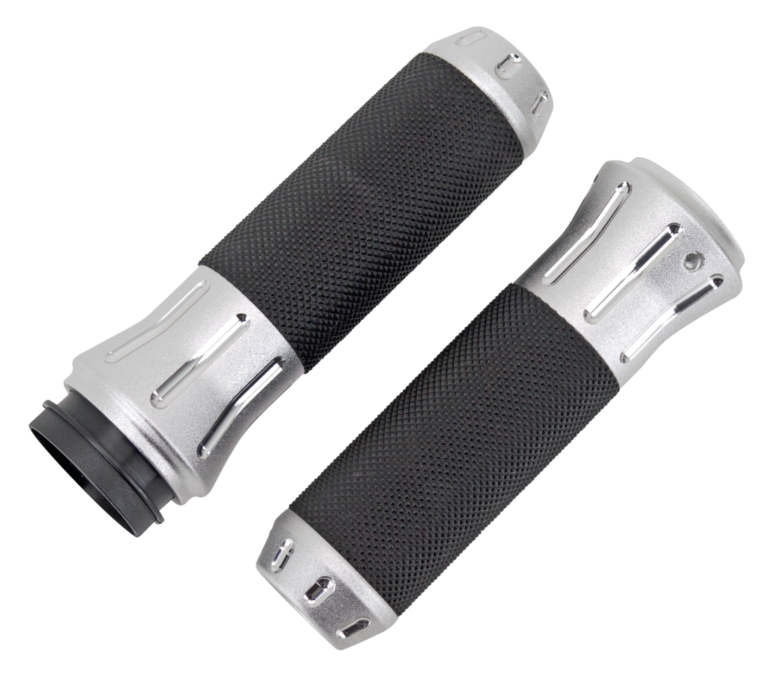 Queste manopole in alluminio billet ricoperte in gomma danno il tocco finale alla vostra moto. Disponibili sia per i modelli con acceleratore a cavo che per quelli con comando Throttle-By-Wire, con finitura cromata, cromata pallinata, nera con tagli a contrasto, o nera Zodiac Stealth una finitura che si abbina al nero dei motori Harley. Ottime in abbinamento con le pedane cambio, freno e poggiapiedi Cobra.