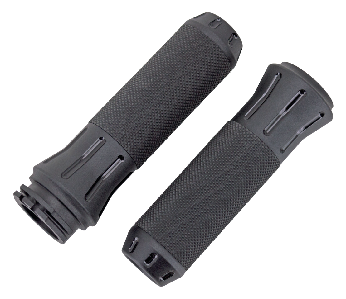 Queste manopole in alluminio billet ricoperte in gomma danno il tocco finale alla vostra moto. Disponibili sia per i modelli con acceleratore a cavo che per quelli con comando Throttle-By-Wire, con finitura cromata, cromata pallinata, nera con tagli a contrasto, o nera Zodiac Stealth una finitura che si abbina al nero dei motori Harley. Ottime in abbinamento con le pedane cambio, freno e poggiapiedi Cobra.