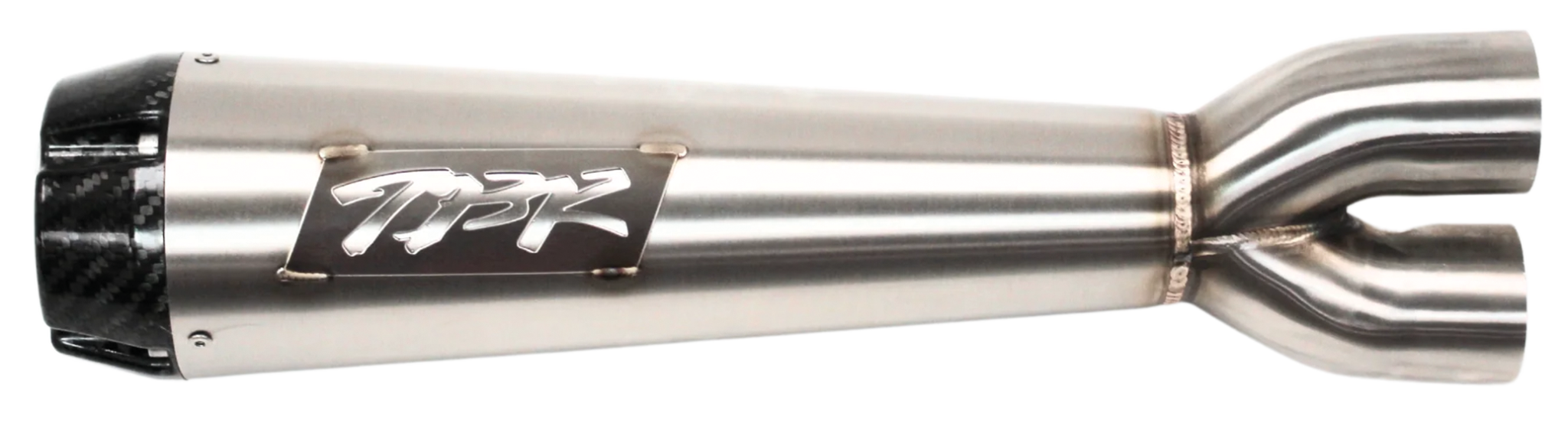 I sistemi di scarico 2-in-1 Two Brothers Racing sono progettati per fornire la massima coppia. Hanno dei collettori in acciaio inox ispirati al mondo delle corse che assicurano risparmio di peso, lunga durata, resistenza all’acqua e un suono stupefacente. Gli scarichi sono forniti completi di paracalore. Dal motore lo scarico parte con due tubi da 1 3/4″ che includono porte per le sonde O2 di serie o da 18mm. Da qui i tubi si allargano a 1 7/8″ prima di terminare in un collettore fissato a molle per avere la massima coppia. Quindi continuano fino a finire nel terminale da 4″ di diametro che vi darà all’uscita un suono incredibile. I terminali Competition S hanno un tappo finale rimovibile in alluminio o in carbonio.