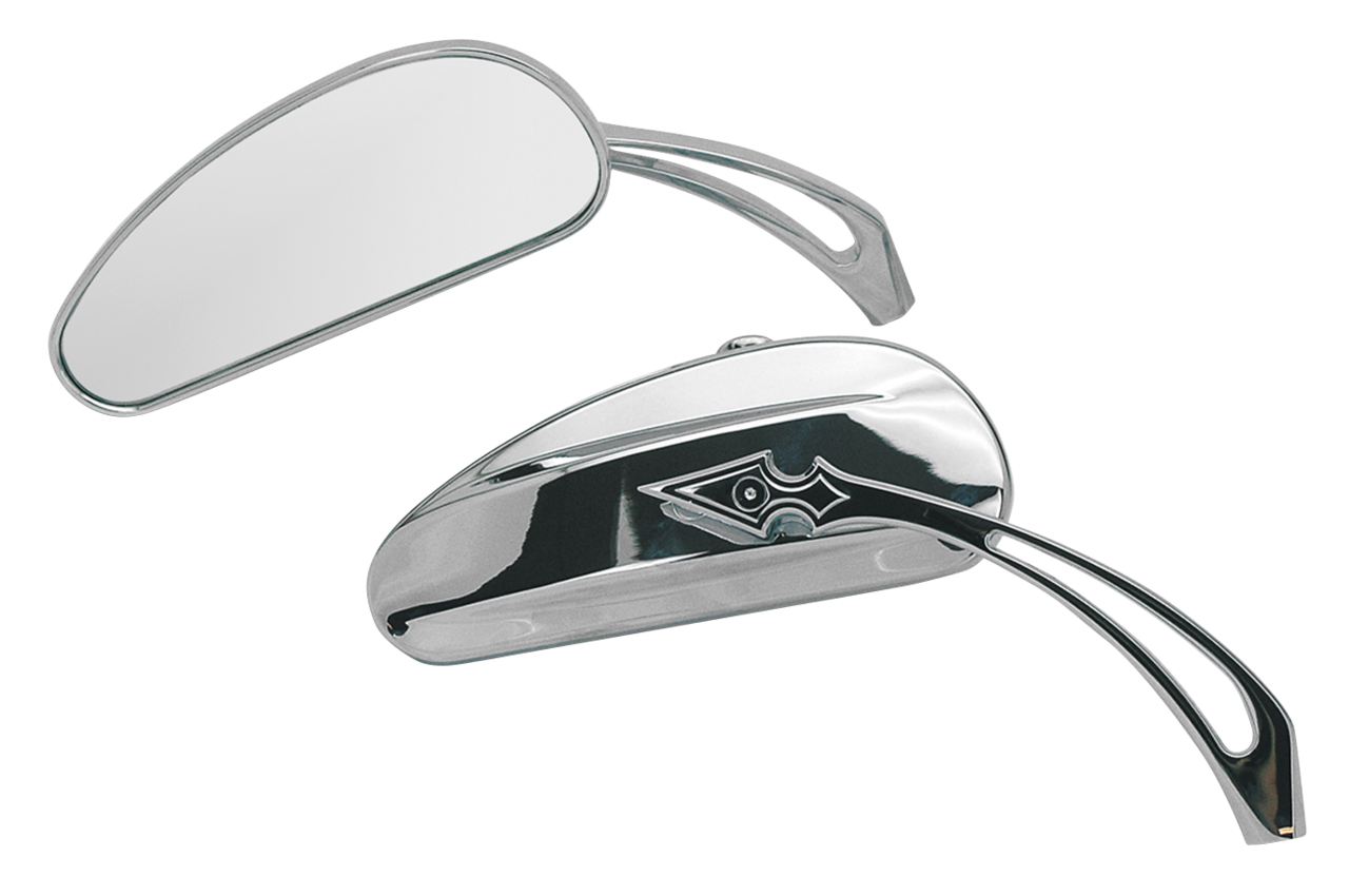 Questi specchietti custom hanno lo stelo con dei dettagli unici un look filante, sono in alluminio billet lavorato a CNC e poi finemente cromati. Venduti singolarmente destro e sinistro.