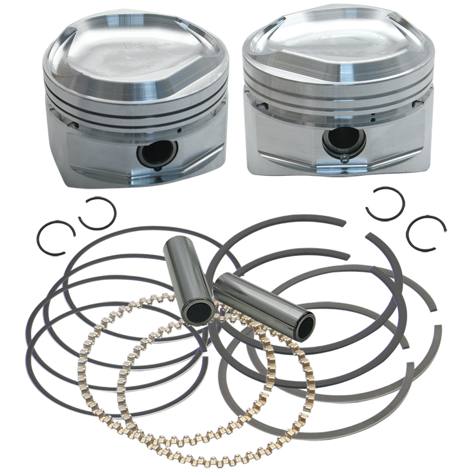 Kit pistoni S&S di ricambio per l’uso in motori S&S 96CI V2, 113CI Super SideWinder e 124CI Super SideWinder Plus, così come su molti kit Big Bore e Stroker S&S e aftermarket. Il kit contiene 2 pistoni, fasce, spinotto e clips. I set di fasce sono disponibili anche separatamente.