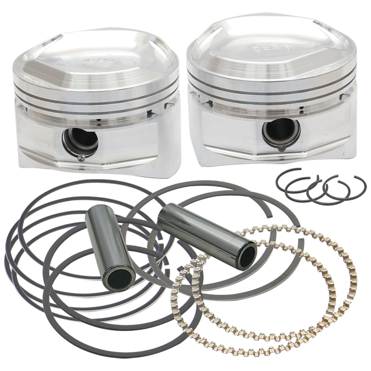 Kit pistoni S&S di ricambio per l’uso in motori S&S 96CI V2, 113CI Super SideWinder e 124CI Super SideWinder Plus, così come su molti kit Big Bore e Stroker S&S e aftermarket. Il kit contiene 2 pistoni, fasce, spinotto e clips. I set di fasce sono disponibili anche separatamente.
