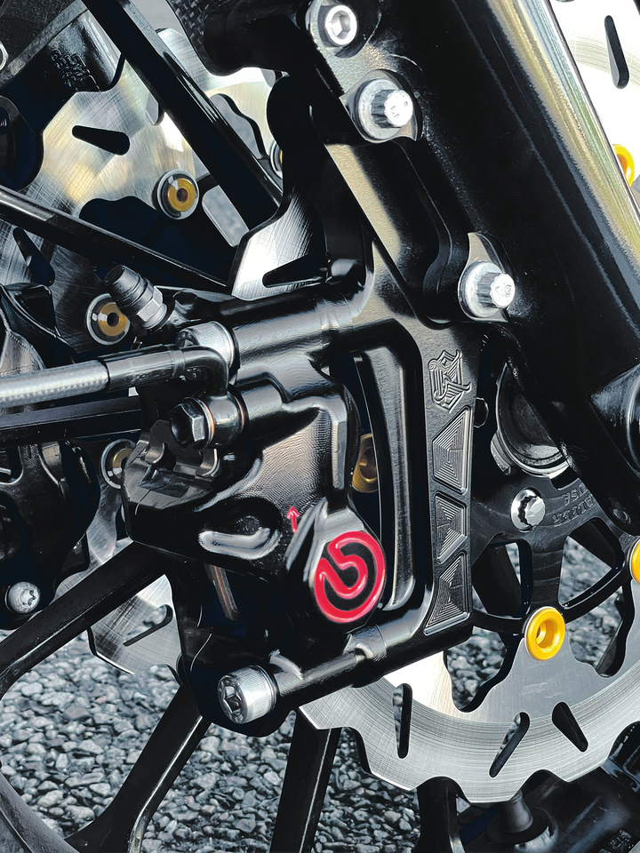 Queste staffe per pinze consentono di installare pinze freno di tipo radiale su forcelle anteriori progettate per pinze ad attacco assiale. Sono da utilizzare con pinze radiali con interasse tra i bulloni di 4 1/4″ (108mm), come le nostre pinze PM Radial a 4 pistoncini. Funzionano anche con pinze di altre marche con la stessa distanza tra i bulloni. Le staffe sono lavorate a CNC in alluminio billet e hanno una finitura anodizzata nera lucida.
