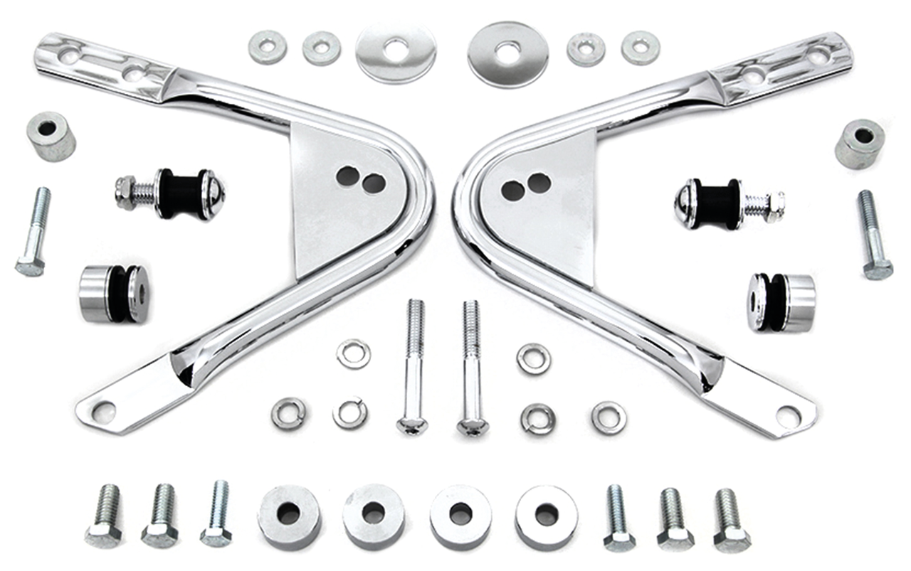 Per FLHR & FLHRC Road King, FLHT & FLHTC Electra Glide, FLHX Street Glide e FLTR Road Glide 1997-2008. I modelli con antenna, richiedono un antenna nascosta o la ricollocazione di quella originale. I modelli con targa molto grande richiedono la ricollocazione della stessa. Tour-Paks prodotti prima del 2006 richiedono la foratura nella parte inferiore della borsa o della griglia di montaggio, Kit attacchi Docki per portapacchi Two-Up o Tour-Pak Two-Up, cromato, V-Twin Mfg. (OEM 53804-06)