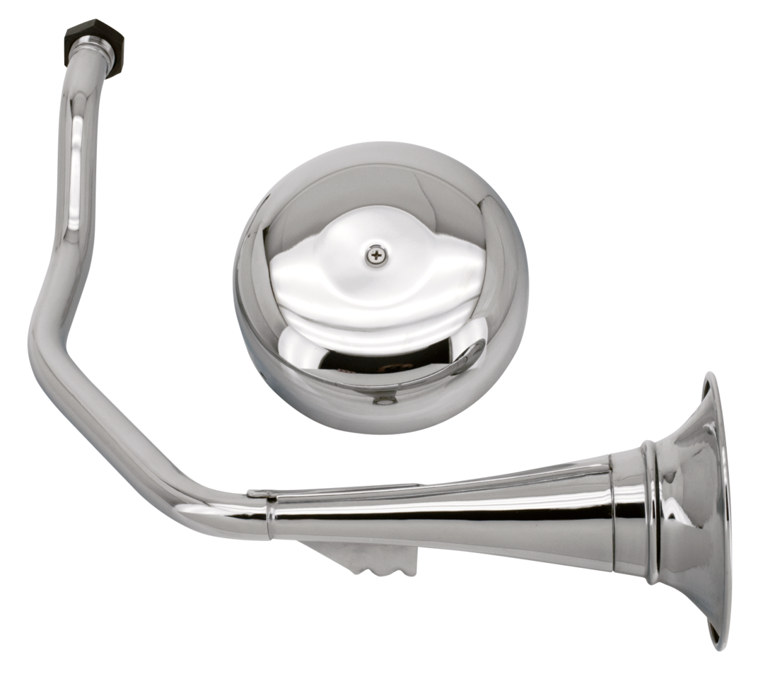 La tromba era di serie sui Panhead Big Twin 1954-1964 con il loro generatore a 6V e scomparve dai modelli 1965 quando Harley passò a 12V. I kit completi hanno una copertura della tromba e una del Power Pack cromate e includono tutto l’hardware necessario. Ottima per chi preferisce l’aspetto classico.