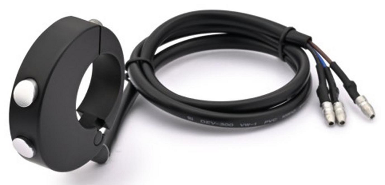 Alloggiamento in alluminio lavorato a macchina con interruttori a pulsante momentanei per manubri da 7/8″ (22mm) e 1″ (25,4mm). L’alloggiamento è largo 12mm (1/2″). Può essere utilizzato a destra o a sinistra. La capacità massima di corrente è di 50 mA, deve essere utilizzata con relè per una capacità superiore.