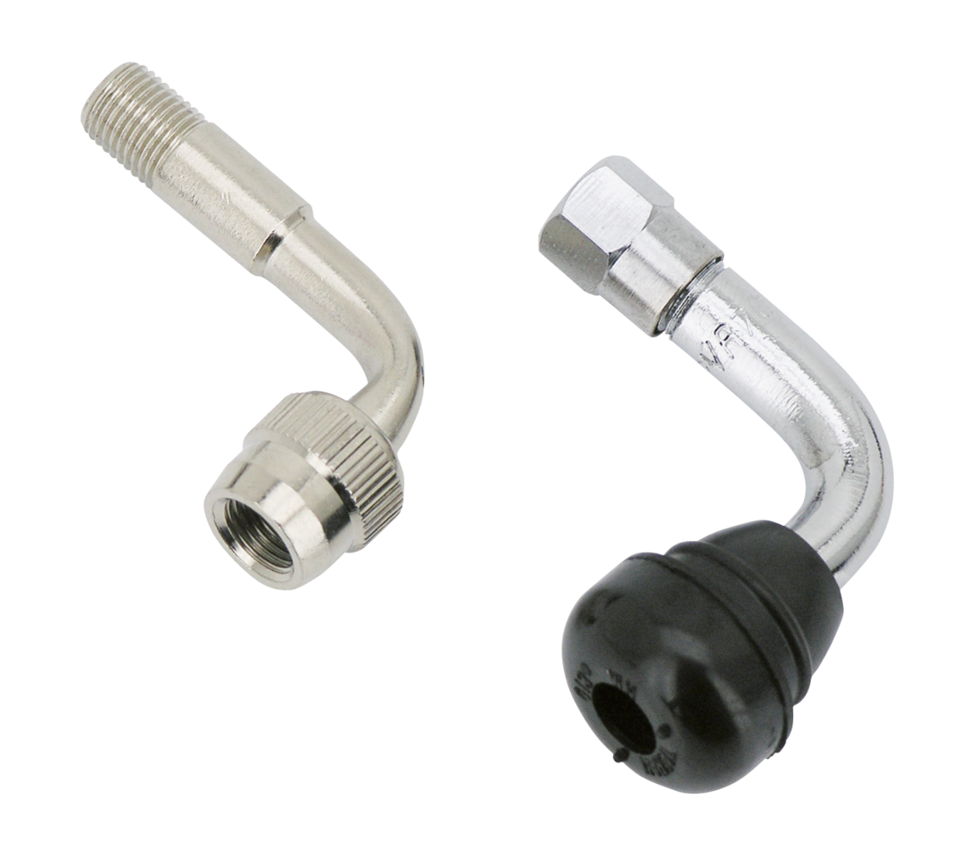 Talvolta è difficoltoso raggiungere le valvole di pneumatici nei cerchi larghi o in quelli a raggi. Questi adattatori valvole o valvole tubeless a 90 gradi rendono la vota molto più semplice. Le valvole tubeless hanno la base in gomma e montano su fori di 11.10mm (7/16″) di diametro. Cromate e vendute singole.