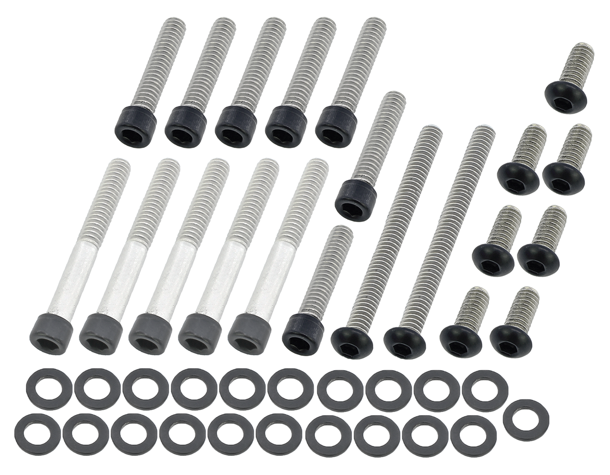 Le viti in acciaio inossidabile con teste verniciate a polvere nera opaca sono il tocco finale per la vostra moto. I kit includono tutte le viti per il coperchio esterno della primaria.