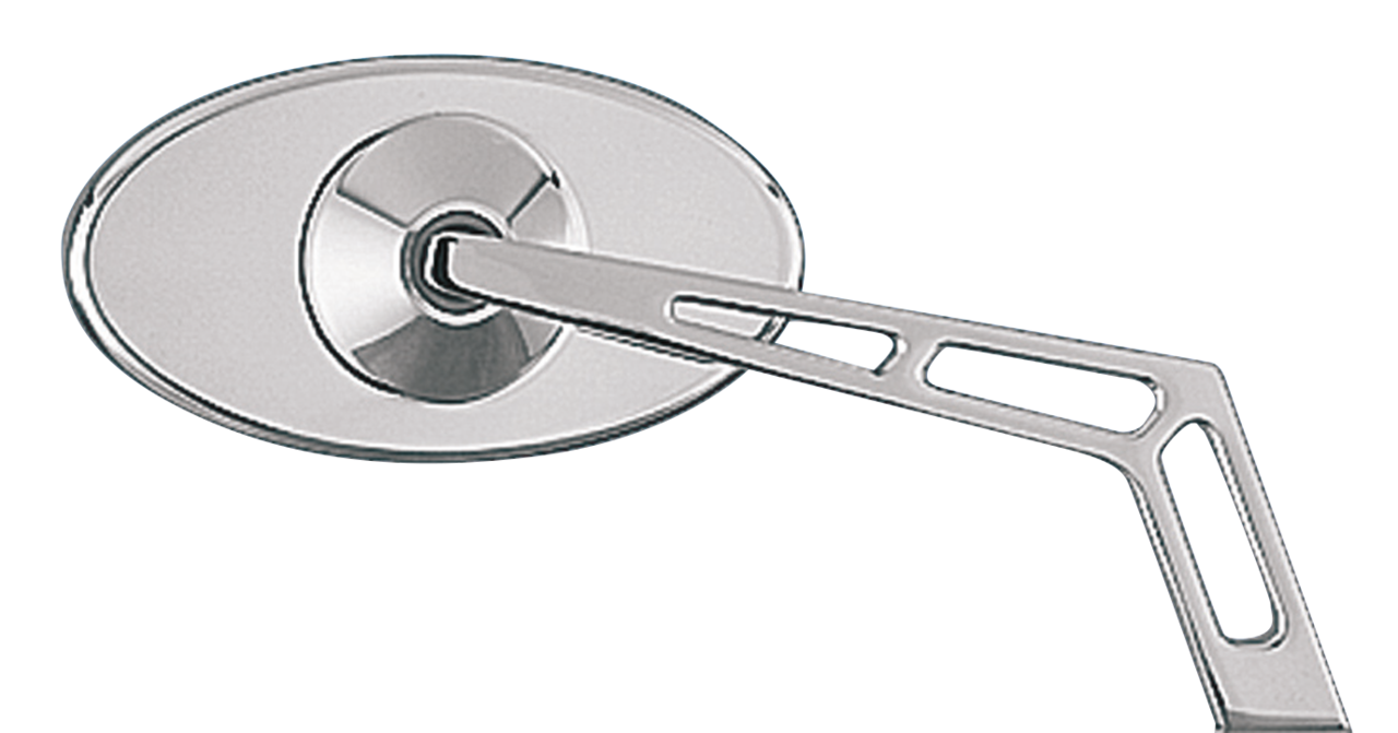 Specchietto ovale liscio e stelo ad angolo cavo. Dimensioni: 5" x 2 11/16" (12,5 cm x 6,8 cm), stelo lunghezza 6 1/2" (16,5 cm).